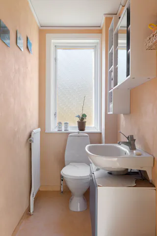 Entréplan: Hall/trapphus, inre hall med toalett och kontor (Går att göra till större badrum). Kök med vardagsrum i fil med matplats. Ett sovrum finns på entréplan.