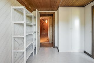 Äldre byggnad som inrymmer garageplats, utrymme för hydrofor samt mindre snickeriverkstad. Gjutet golv, träfasad och eternittak.