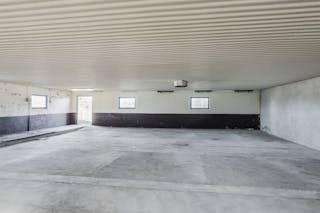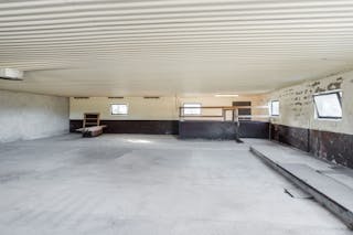 Rymlig maskinhall med skjutportar. Stomme i trä, grusat golv, med plåt på väggar och tak. Mått ca 8x16 m.