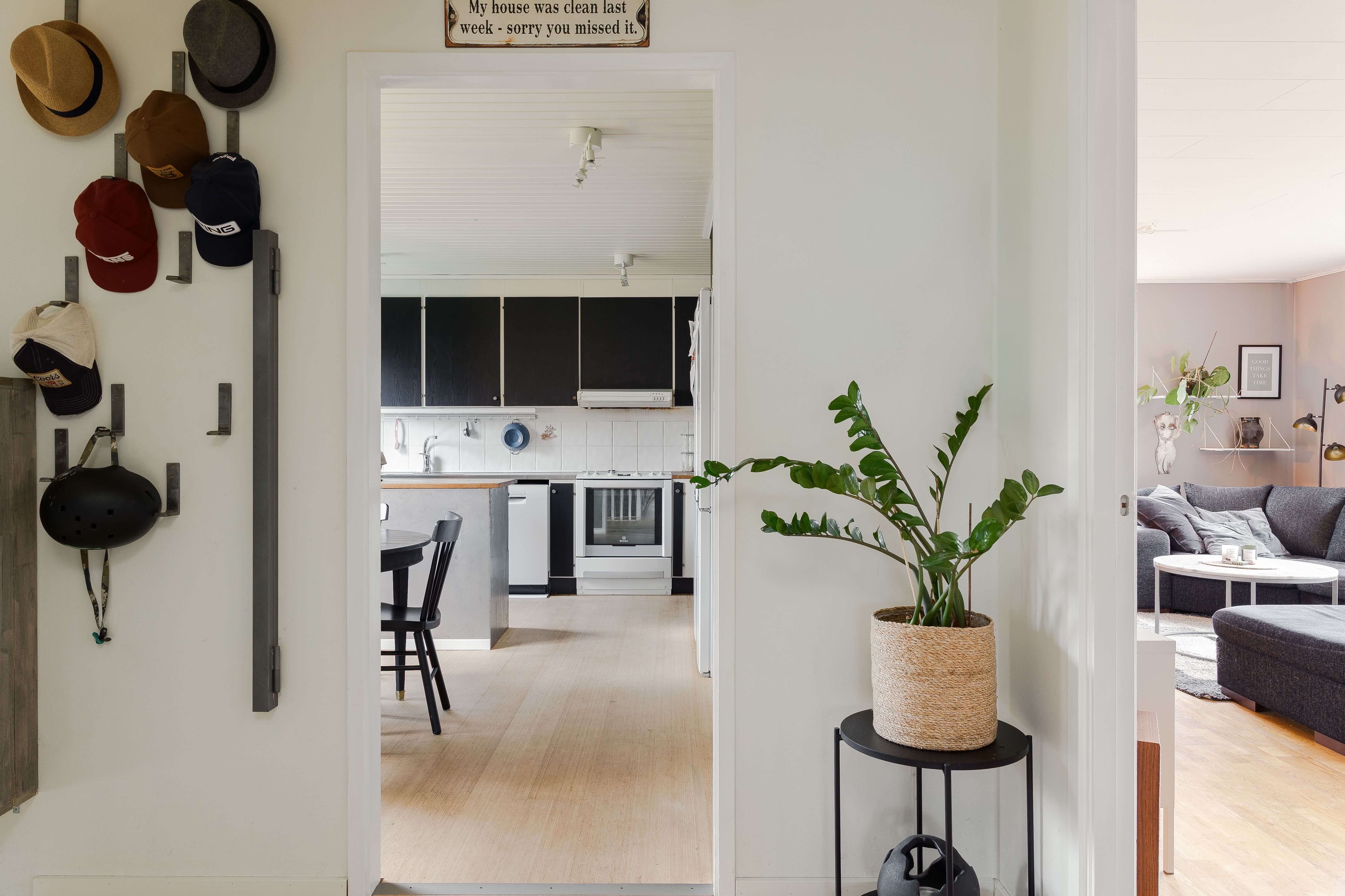 Via farstukvisten kommer du in i entréhallen, där en halvtrappa leder upp till den inre hallen och vidare in i bostaden. Här finns även trappan ner till källaren.