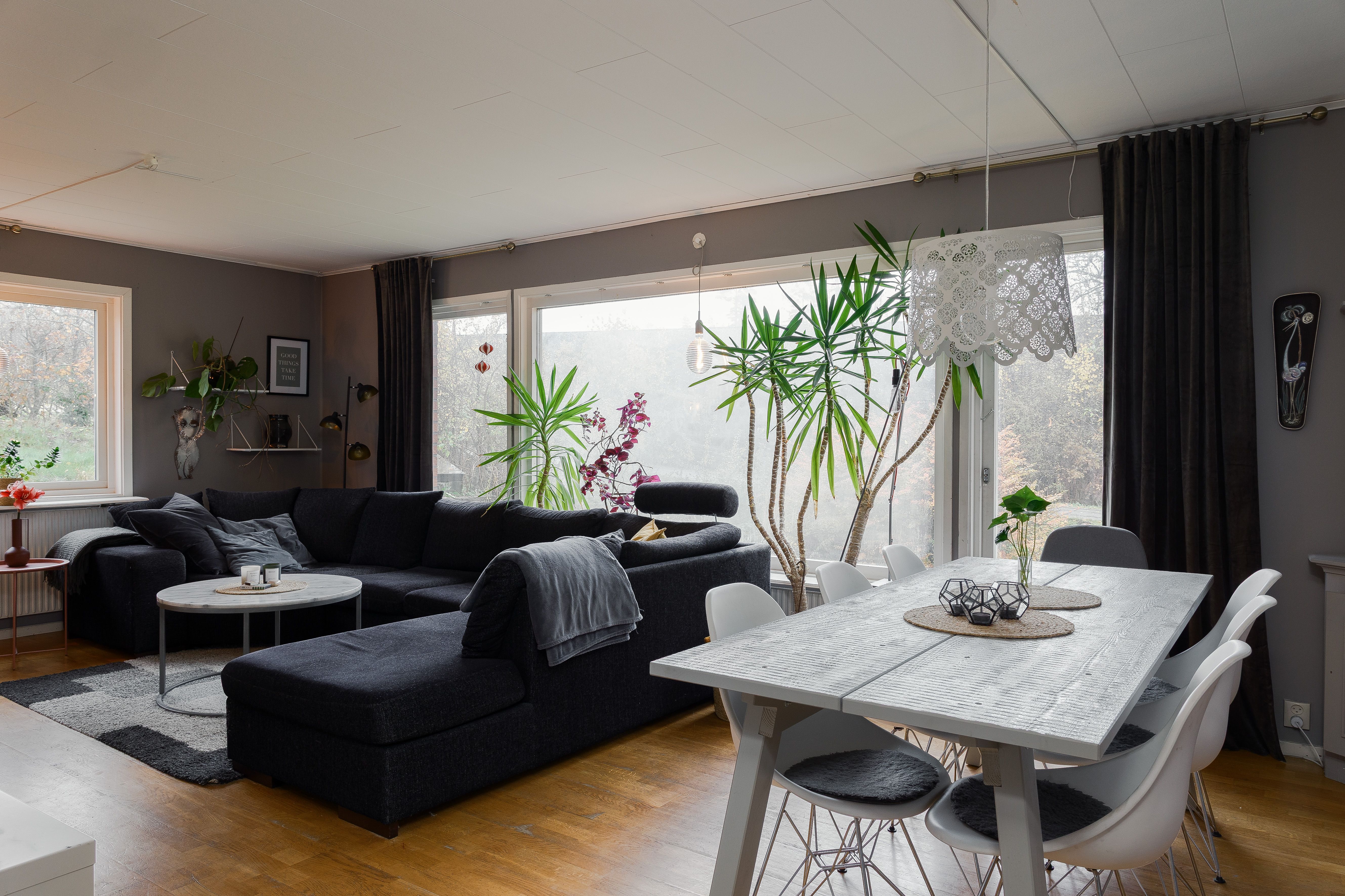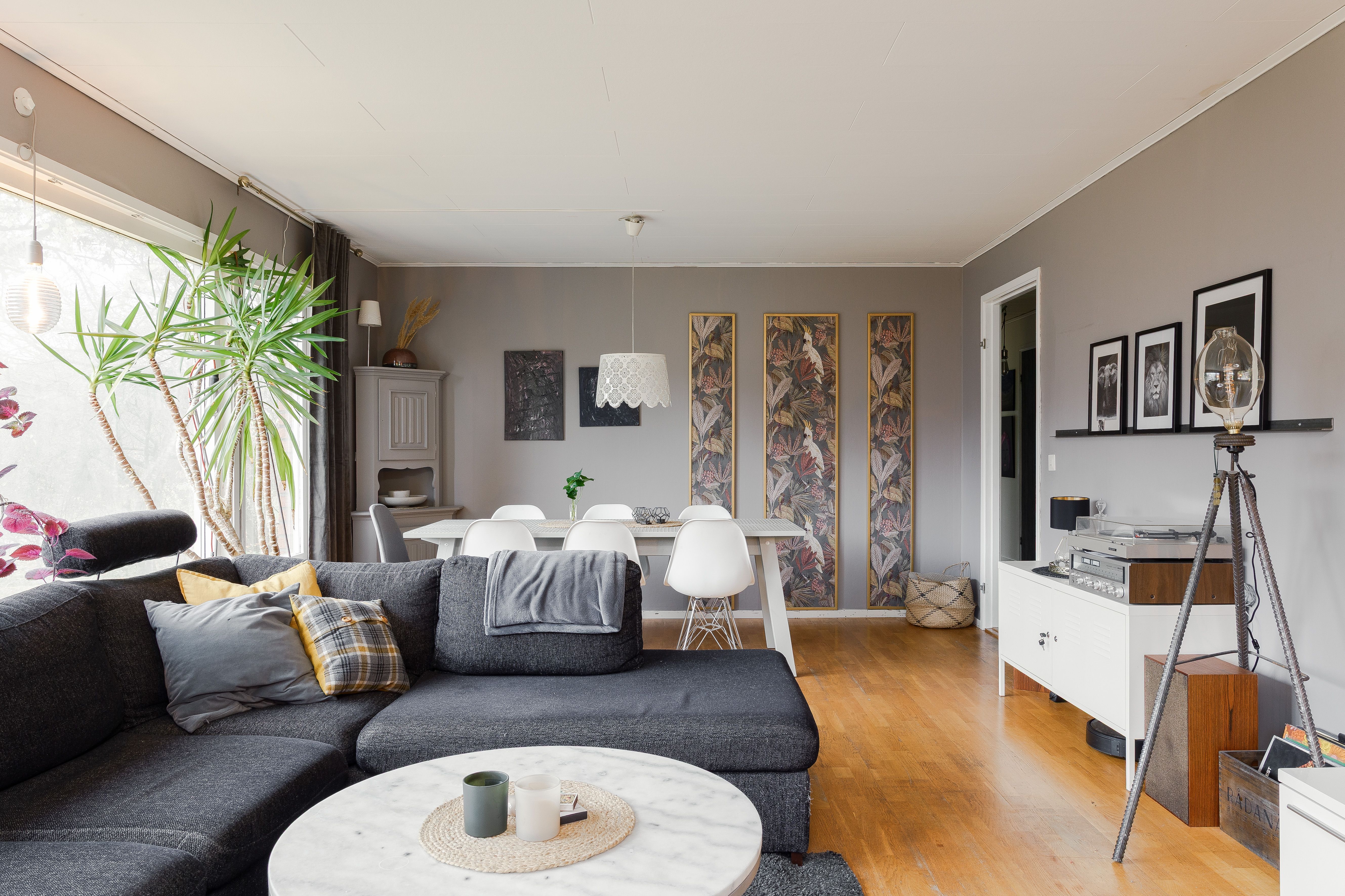 Vardagsrum: Ljust och luftigt med stora fönster åt två håll som ger fint ljusinsläpp. Tapetserade väggar och parkettgolv.