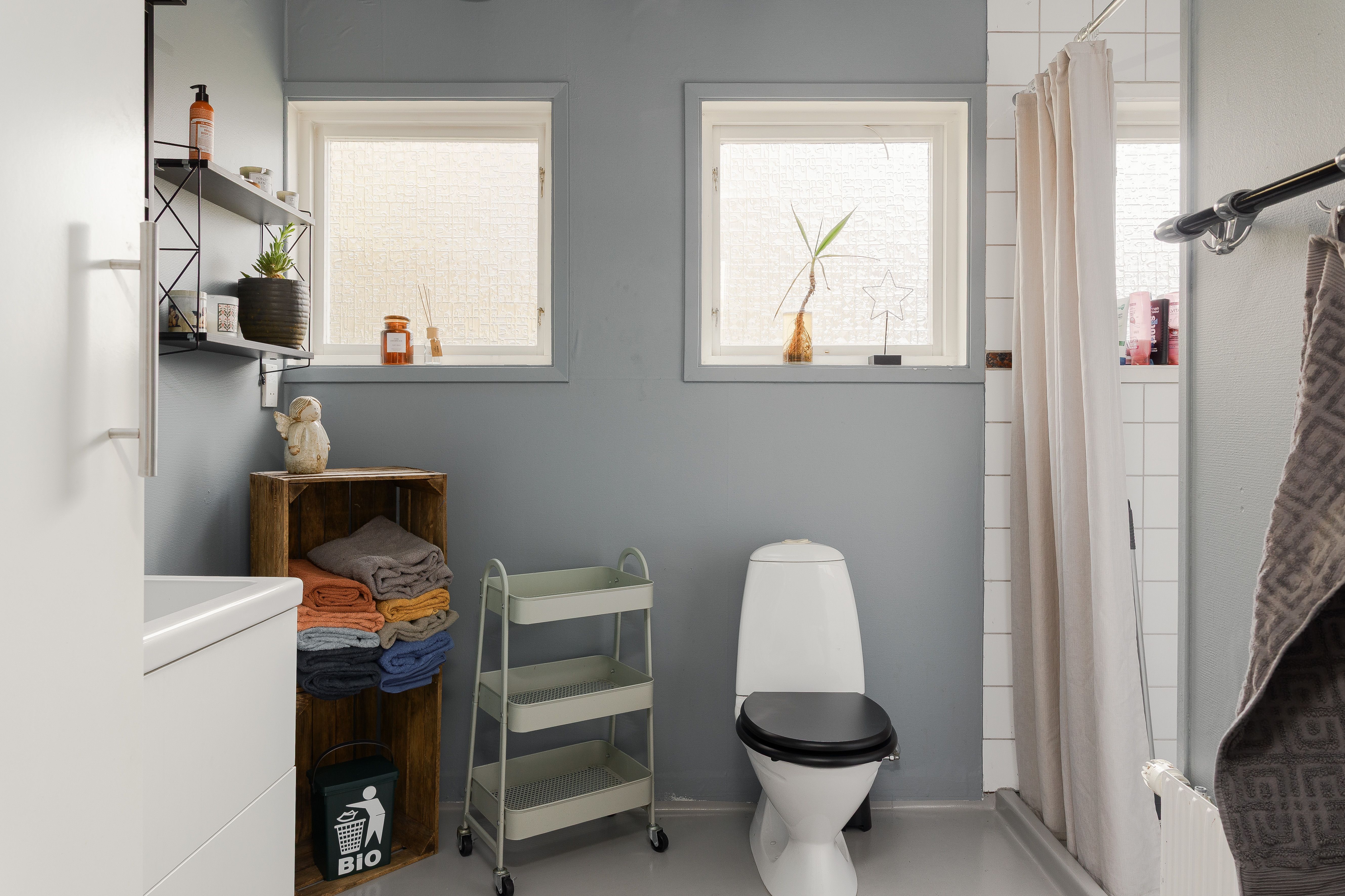Badrum: Funktionellt badrum med wc, handfat och dusch. Våtrumsmatta på golv och väggar, samt kakel i duschhörnan.