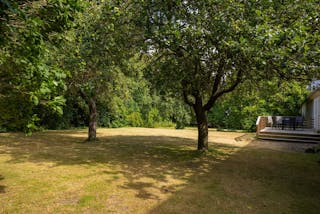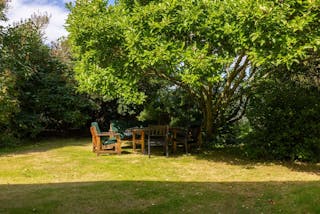 Till huset hör en uppvuxen trädgård med äldre träd och buskar, gräsytor och växthus. Runt gårdsplanen löper tre längor som tillsammans med bostadslängan ramar in gårdscentrum. Här finns äldre drängkammare, förråd, stall, loge och garage.