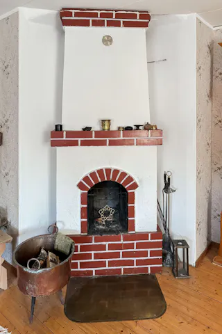 Stort rum med öppen spis.