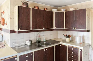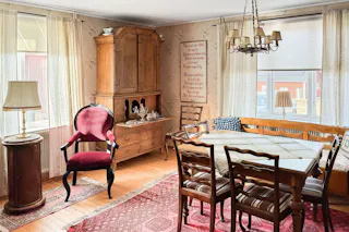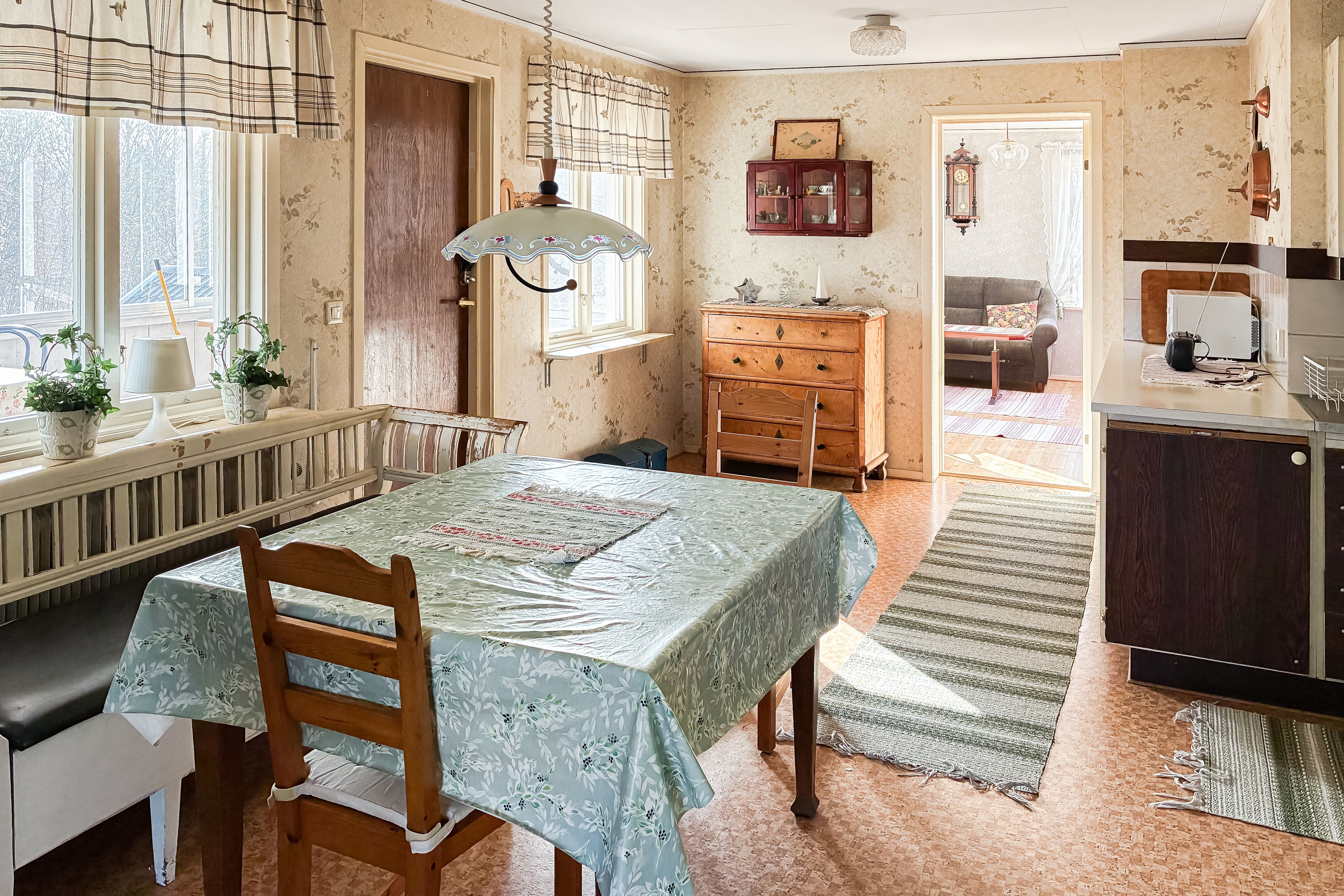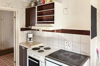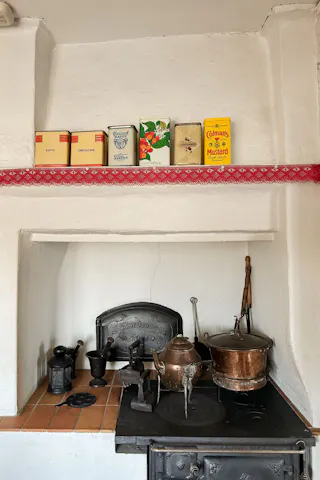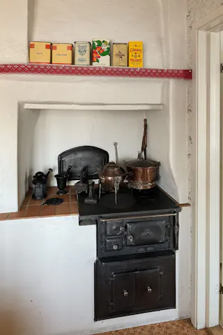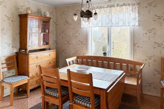 Kök med vedspis, intilliggande matrumsdel.