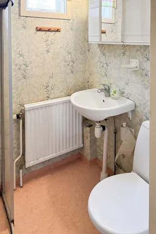 Badrum, wc, handfat och dusch.