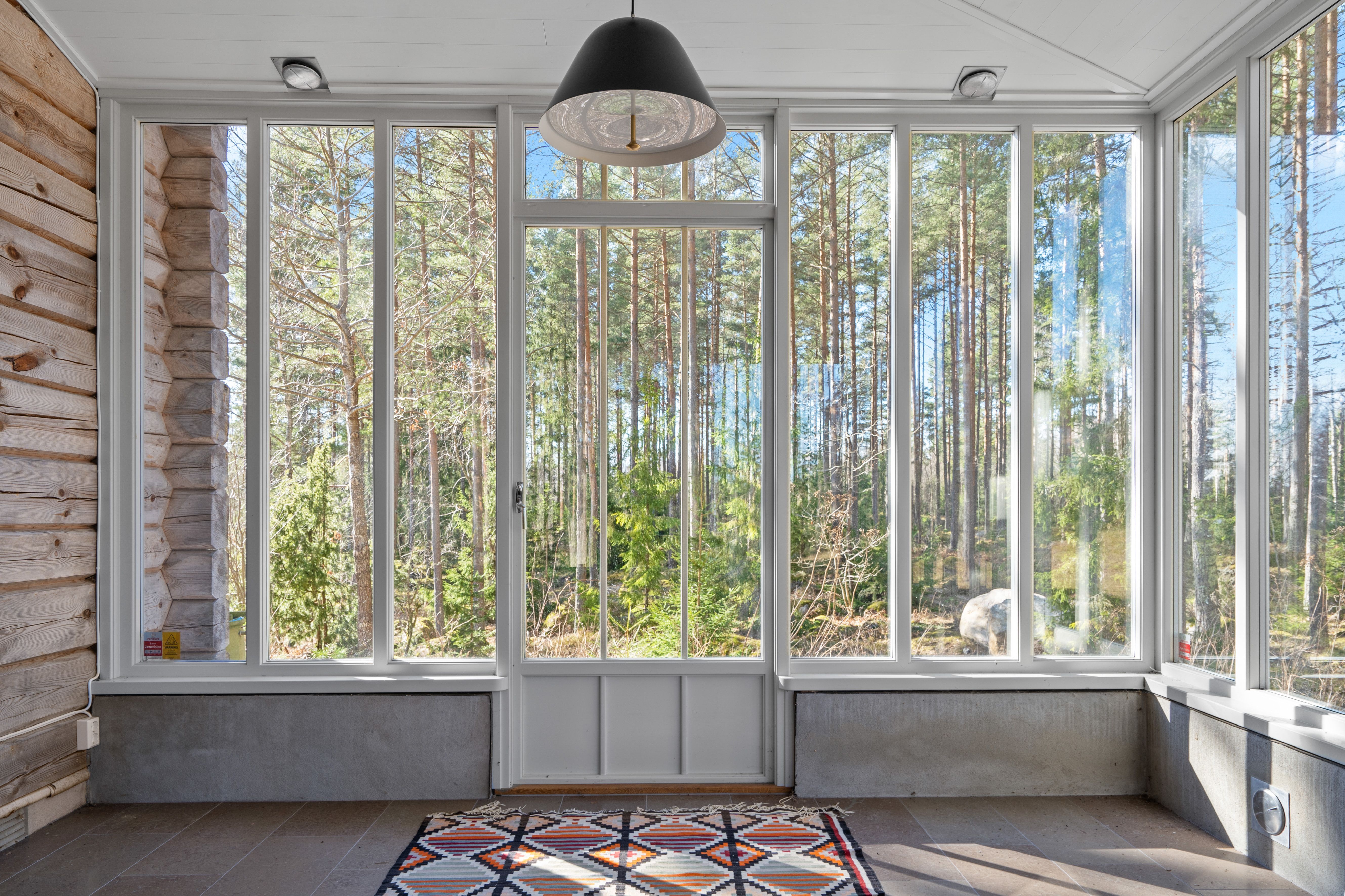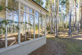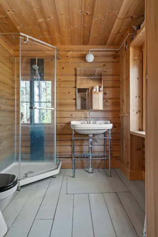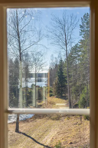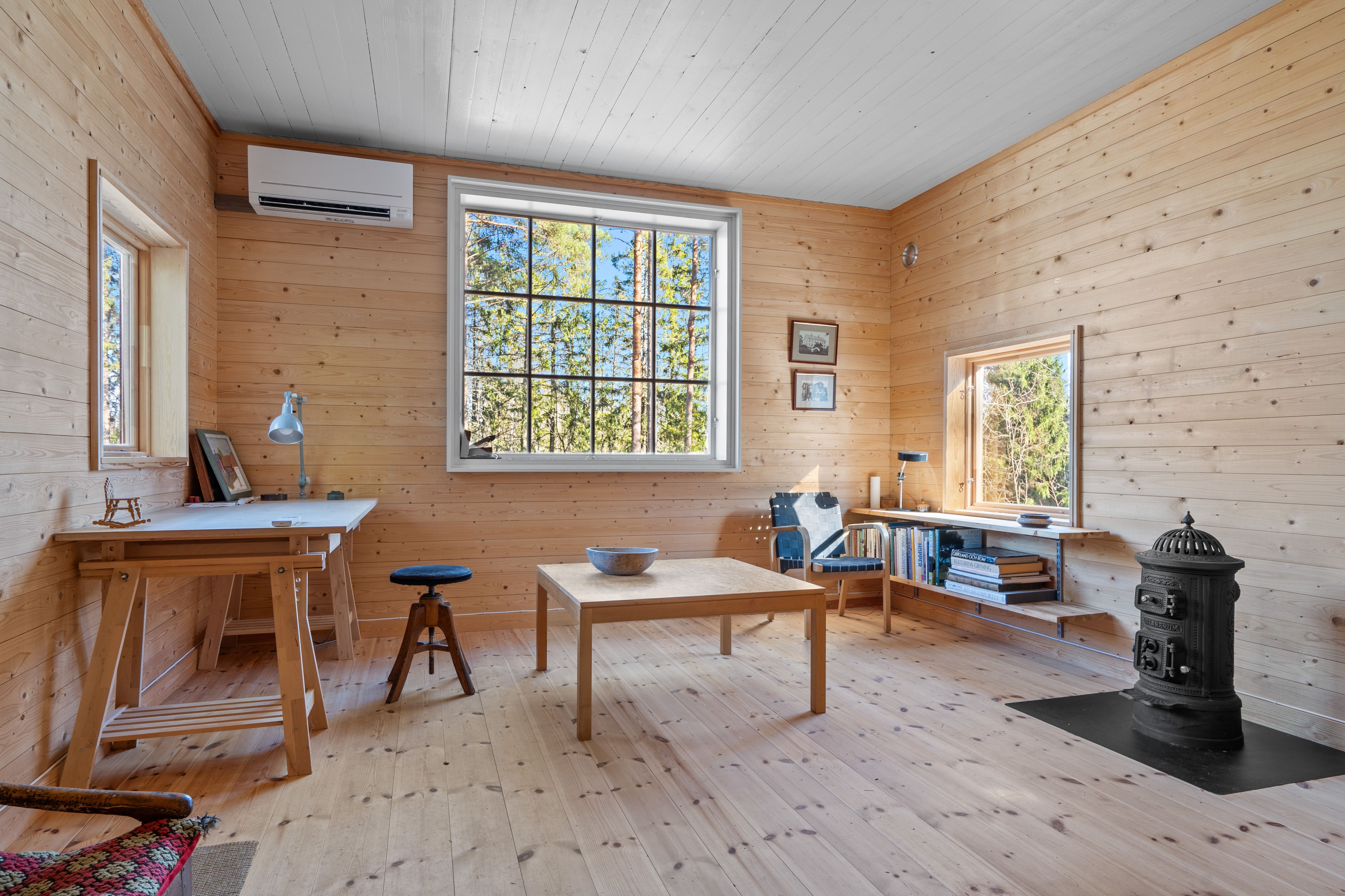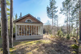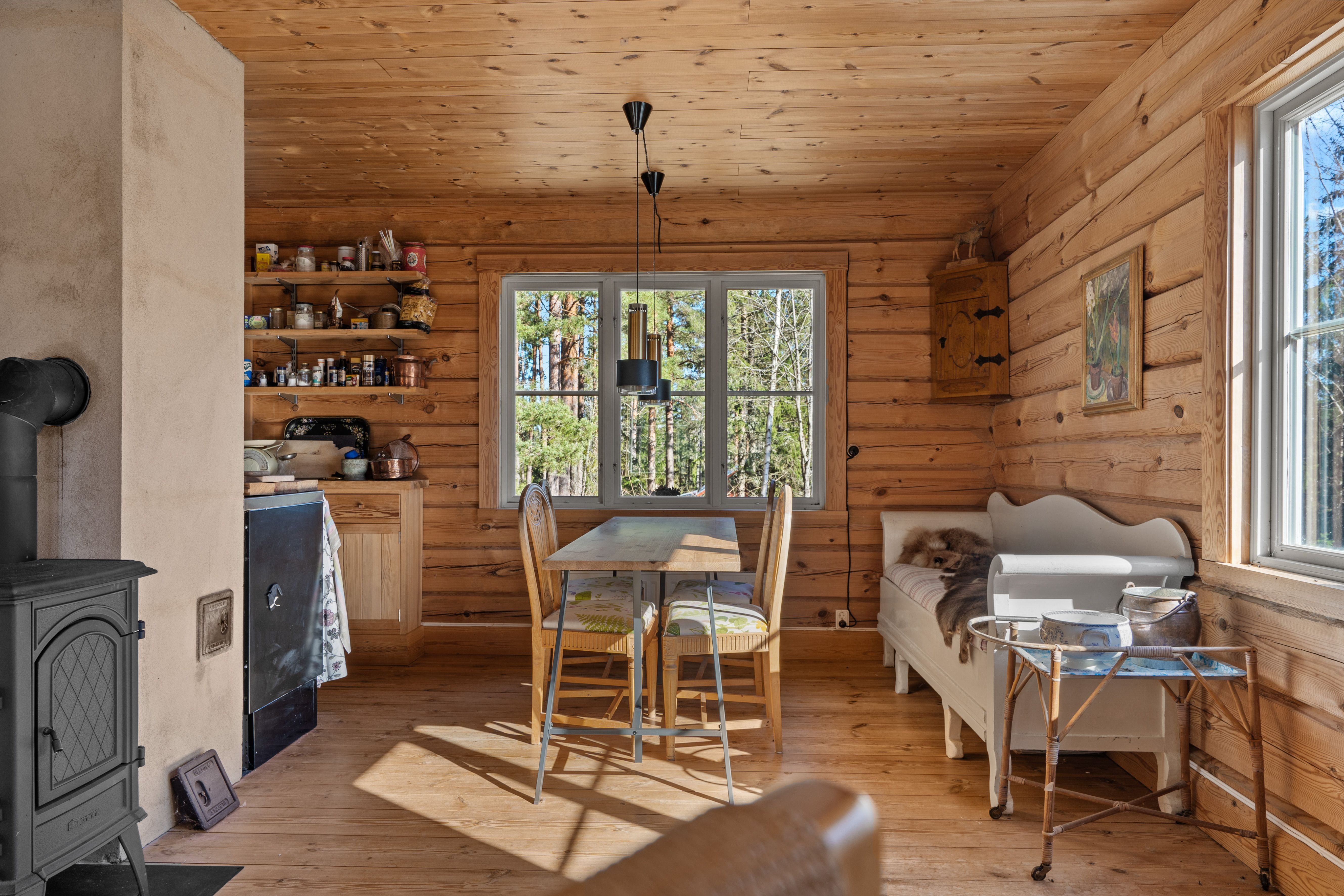 Entré till hall. Kök, matplats och vardagsrum i öppen planlösning med generöst ljusinsläpp och utsikt mot sjön. Vedkaminen är centralt placerad i rummet. Sovrum med utgång till orangeri/uterum med gasolbrännare, där stora glaspartier skapar en känsla av att befinna sig i skogen. På entréplanet finns även ytterligare ett sovrum samt ett duschrum med trägolv och träväggar, utrustat med handfat, wc och dusch med glasväggar.