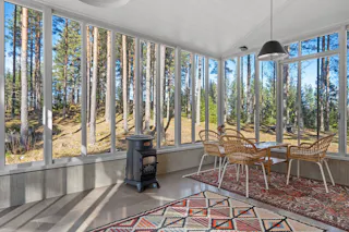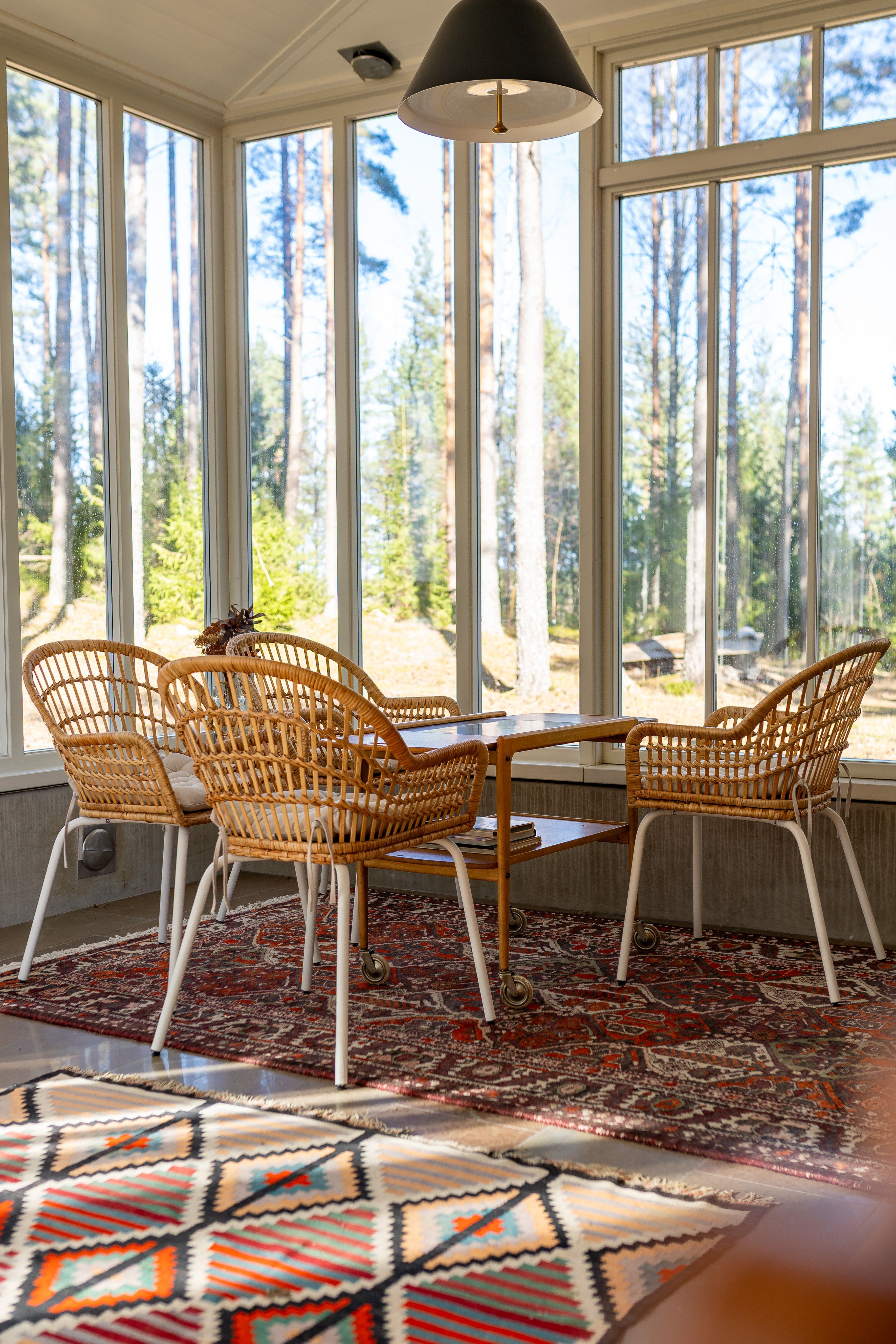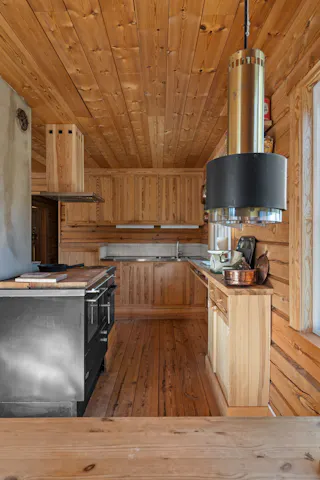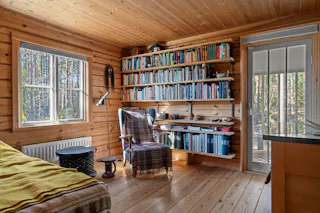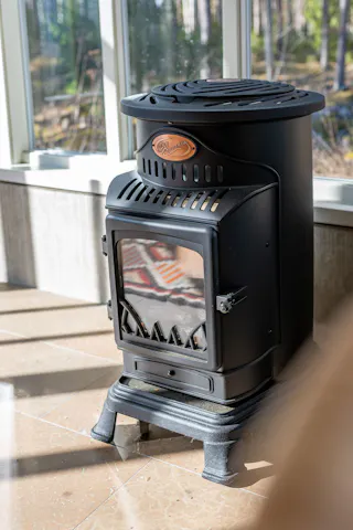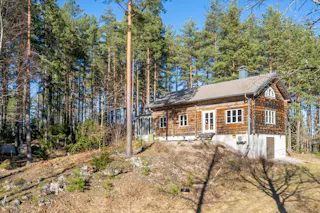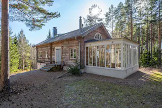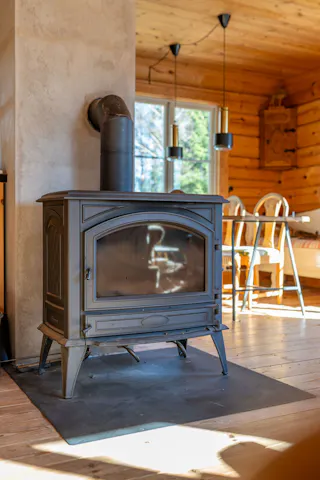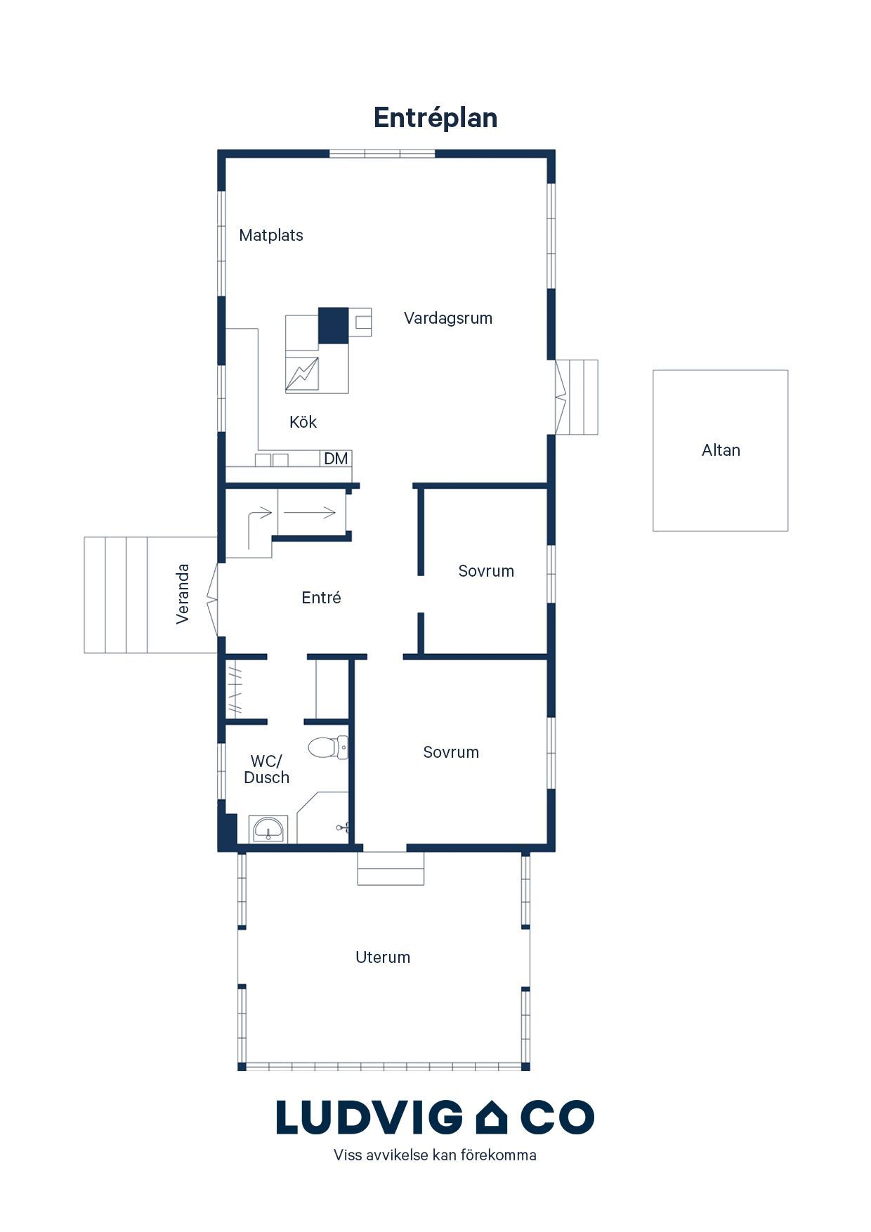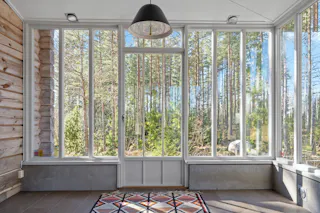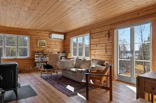 Entré till hall. Kök, matplats och vardagsrum i öppen planlösning med generöst ljusinsläpp och utsikt mot sjön. Vedkaminen är centralt placerad i rummet. Sovrum med utgång till orangeri/uterum med gasolbrännare, där stora glaspartier skapar en känsla av att befinna sig i skogen. På entréplanet finns även ytterligare ett sovrum samt ett duschrum med trägolv och träväggar, utrustat med handfat, wc och dusch med glasväggar.