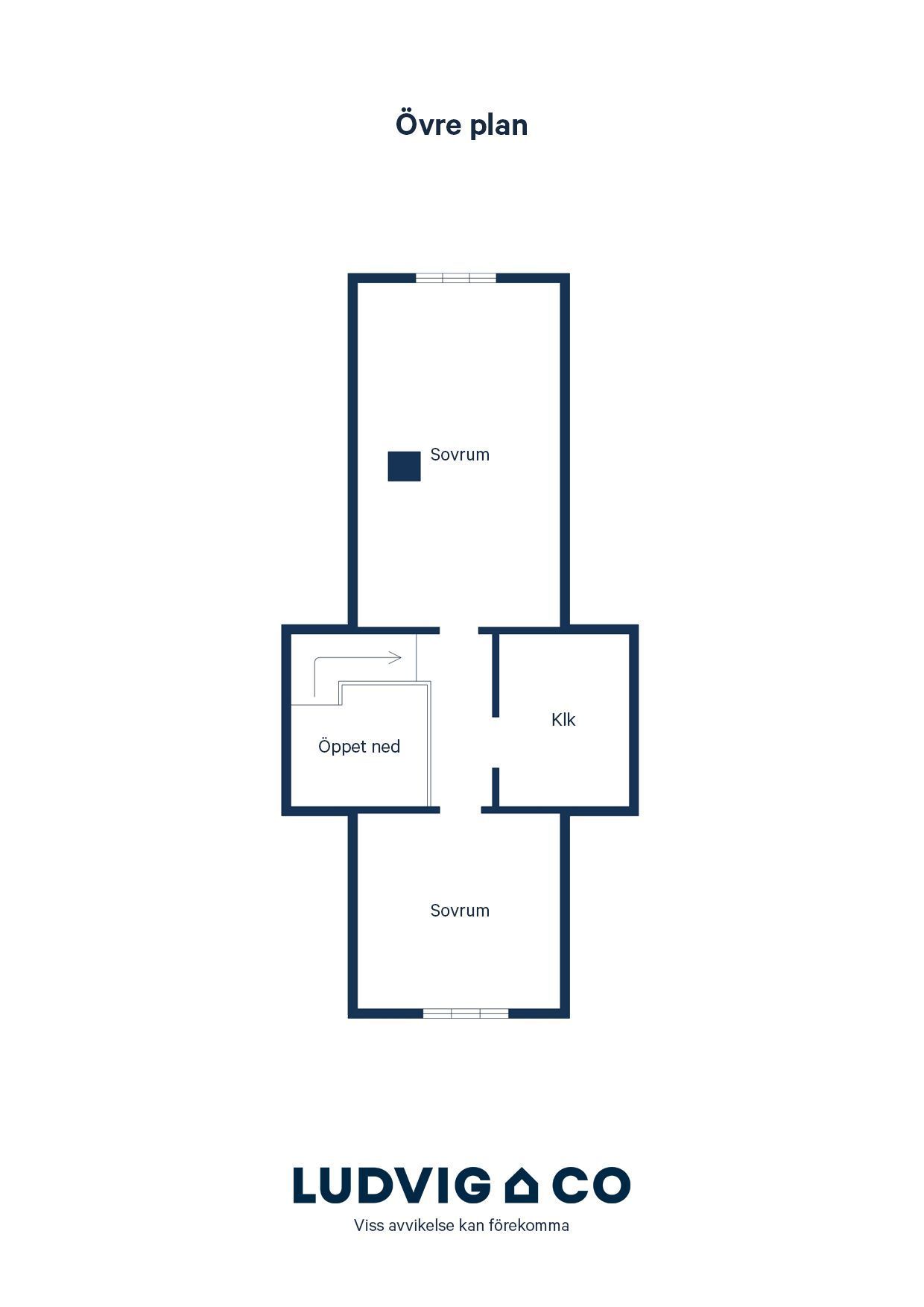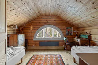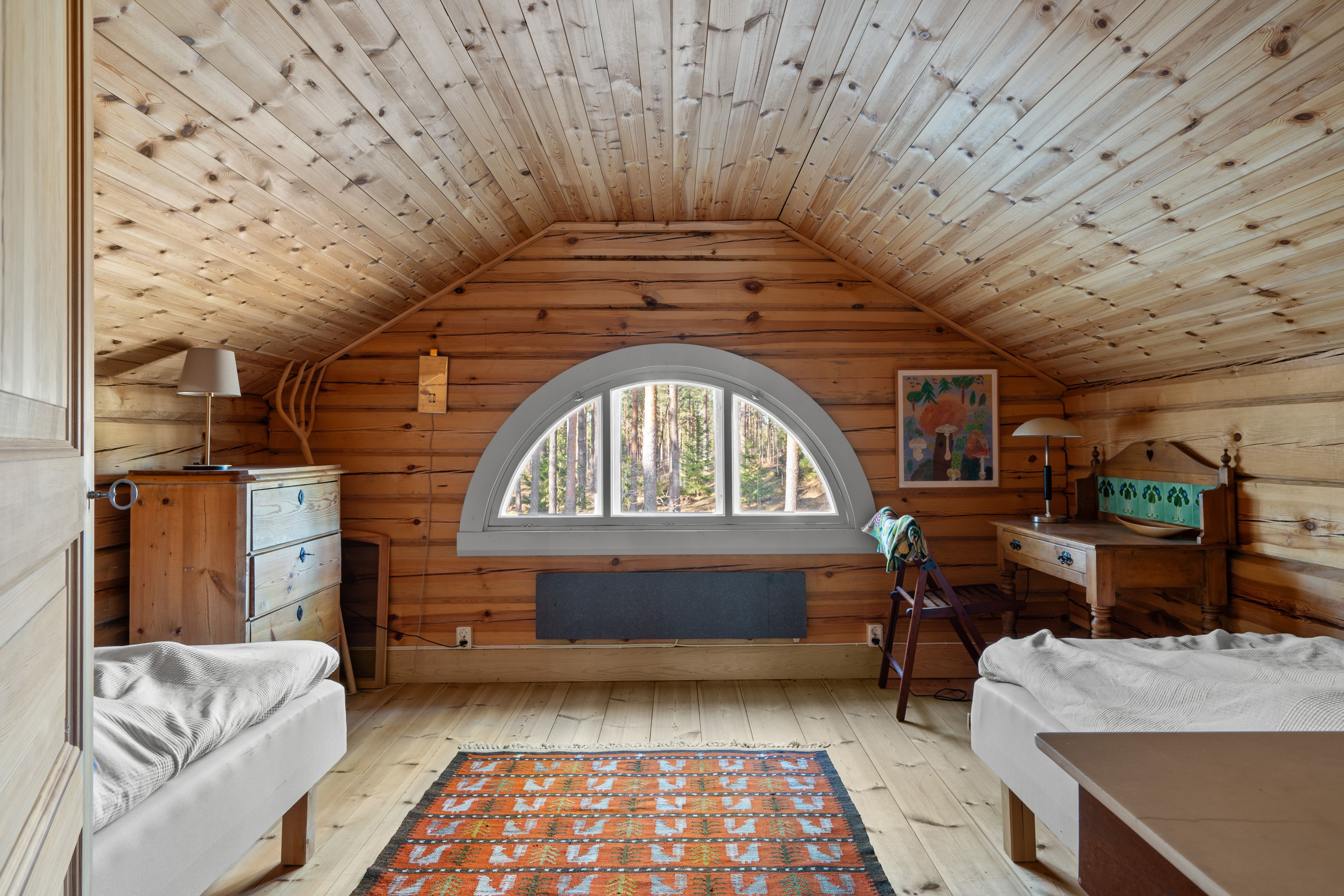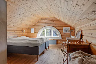 Övervåningen inrymmer två sovrum med snedtak och halvmåneformade fönster. Här finns även en klädkammare samt en mindre hall som öppnar sig ned mot entréplanet, vilket bidrar till rymd och ljus.