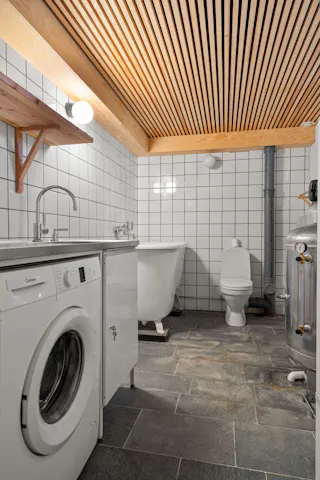 Källarplanet omfattar ett kombinerat badrum och tvättstuga med kaklade väggar och klinkergolv. Här finns även garage, matkällare samt utrymmen anpassade för både hobbyverksamhet och förvaring.