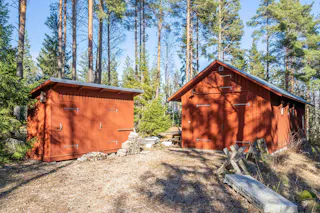 Fullt isolerad byggnad uppförd på gjuten platta. Fasad av stående panel under tak av plåt. Byggnaden håller garage samt kontor/gästrum. Uppvärmning via
