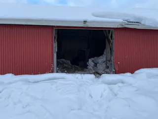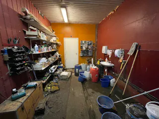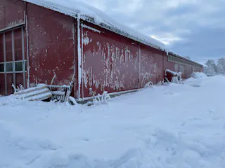 Enklare maskinhall, f.d. fårhus, används till förvaring.