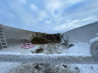 Flytgödselbrunn, volym ca 2400 m³ (presenning behöver förnyas).