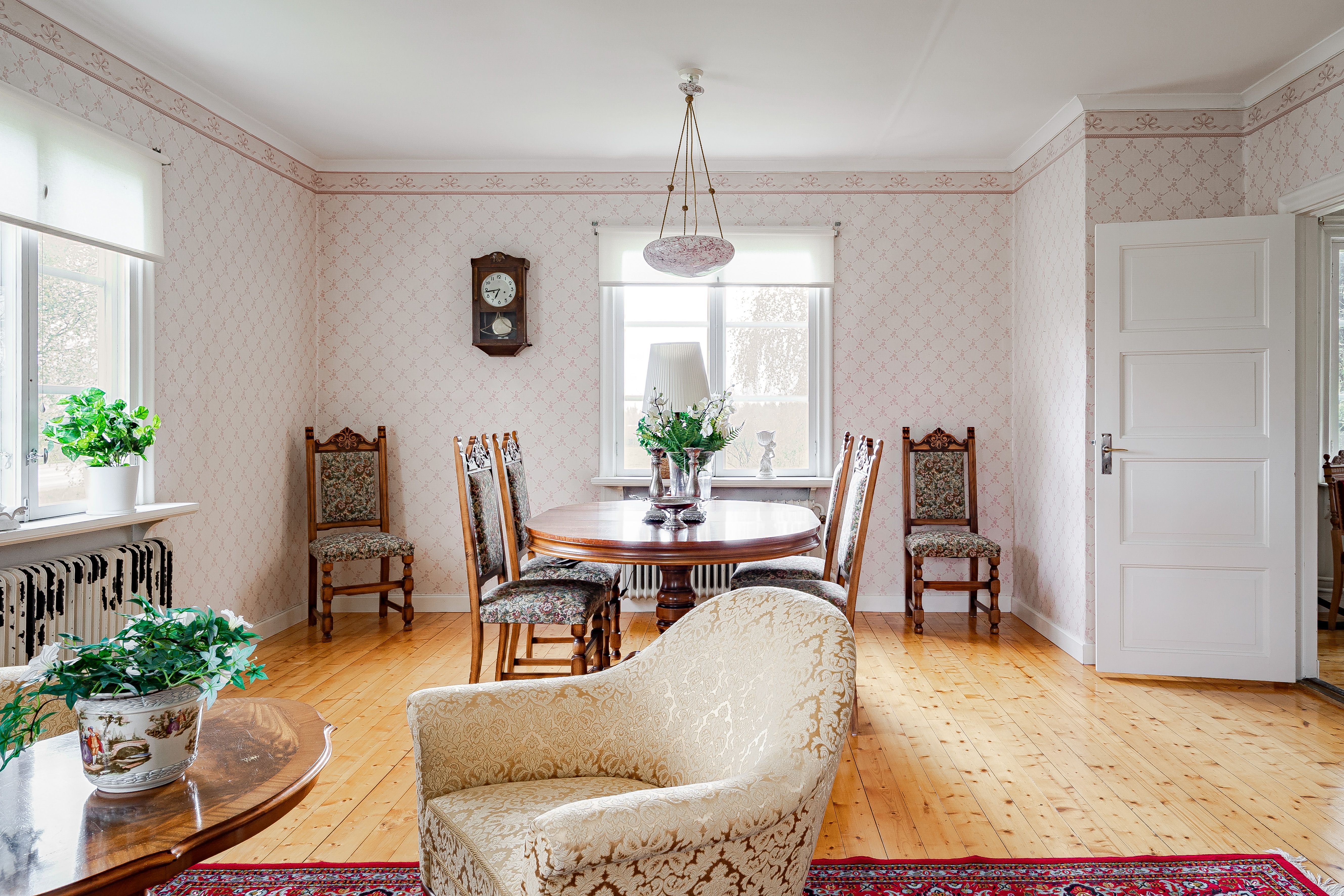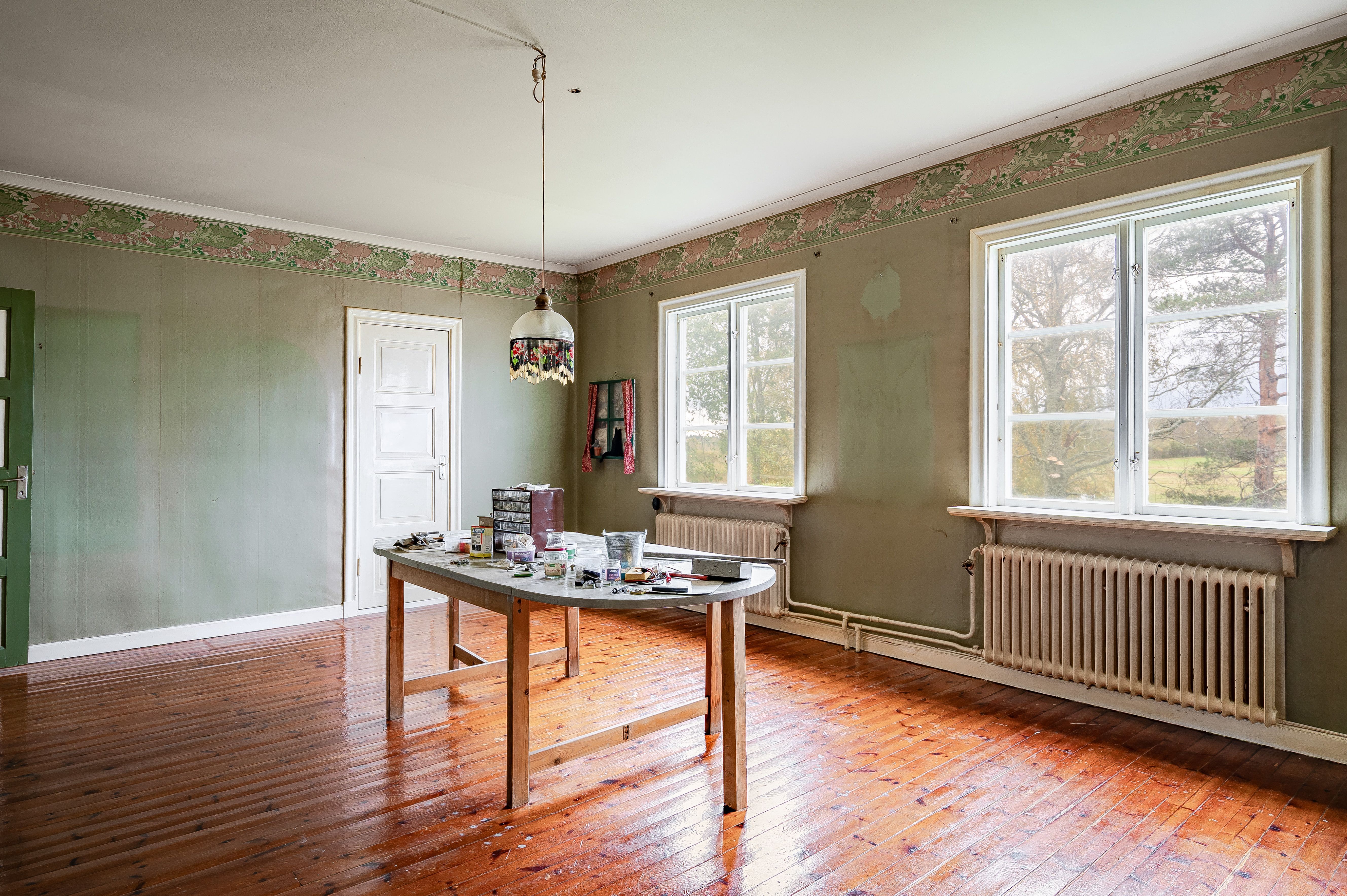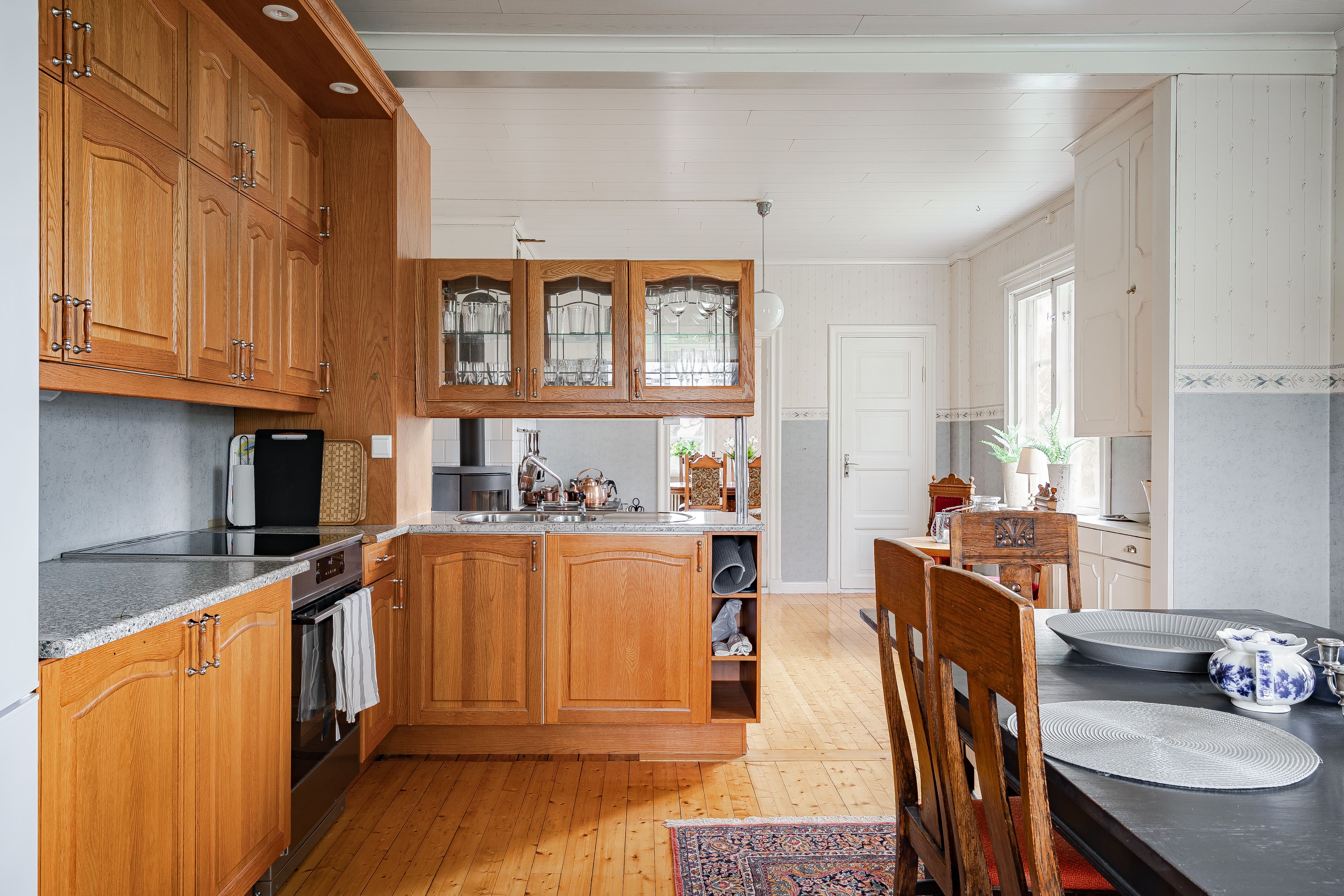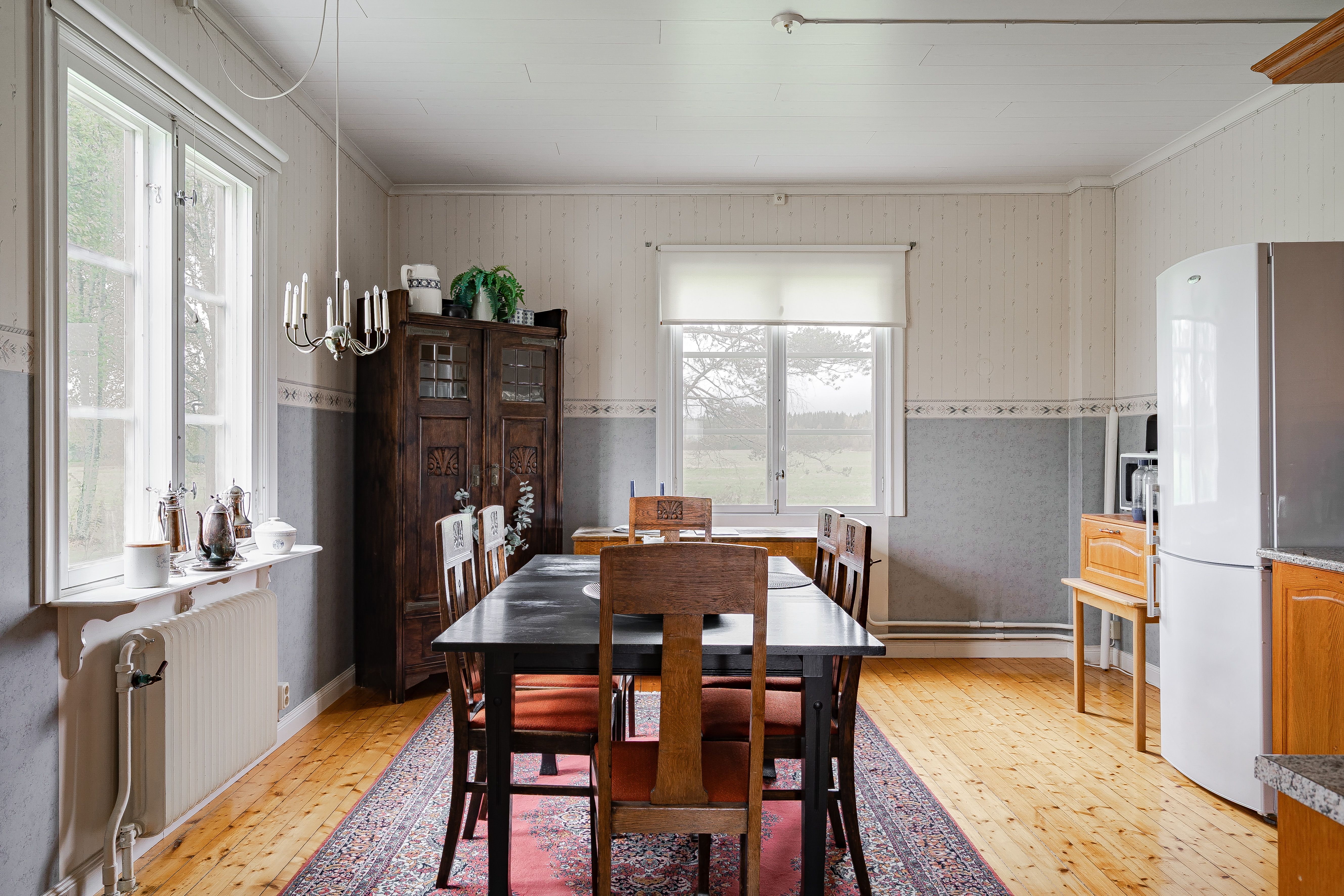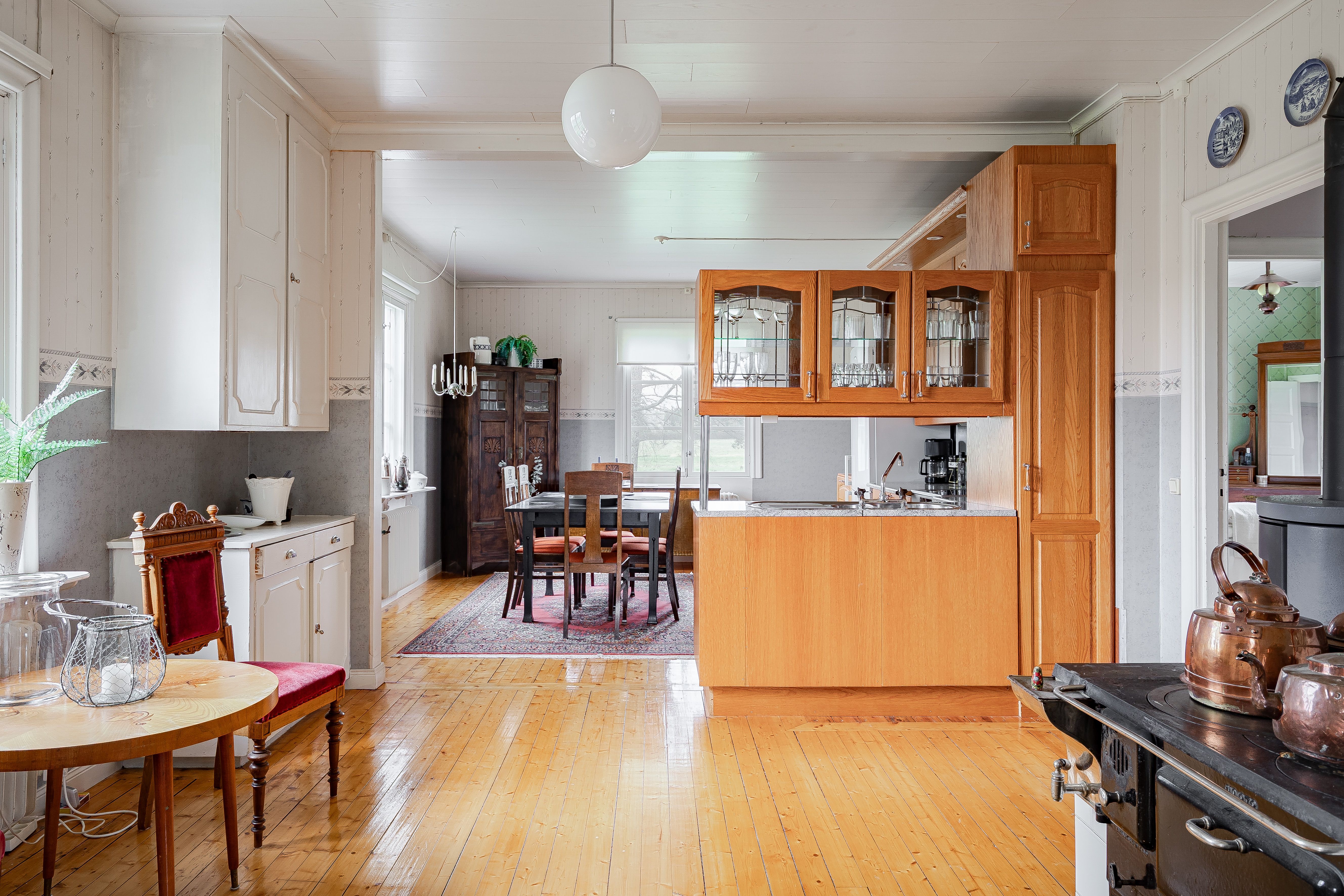 Huset om 194 m2 fördelat på ett stort kök med ny installerad täljstenskamin och en gammal järnspis samt sal med matplats och plats för två sittgrupper samt ett sovrum. Samtliga med ljuvliga trägolv. På entréplan finns även badrum med wc och dusch. Övre plan har i dagsläget två stora sovrum och ett rum under renovering till kanske badrum med bastu och dusch.