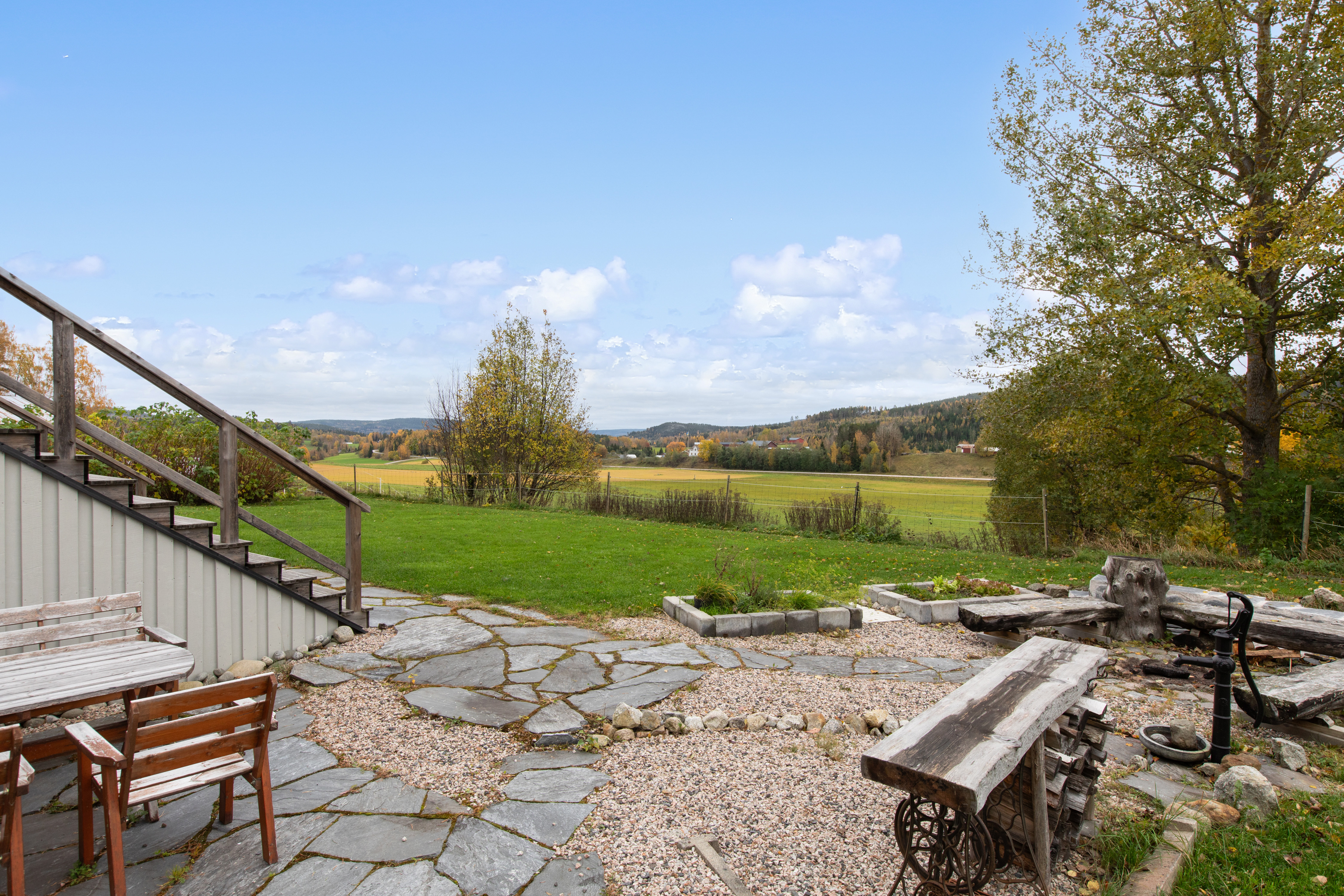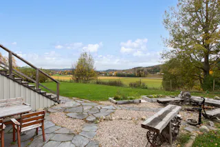 Fin uteplats/grillplats på nedsidan huset med hagar runt om.