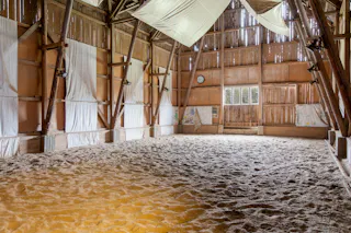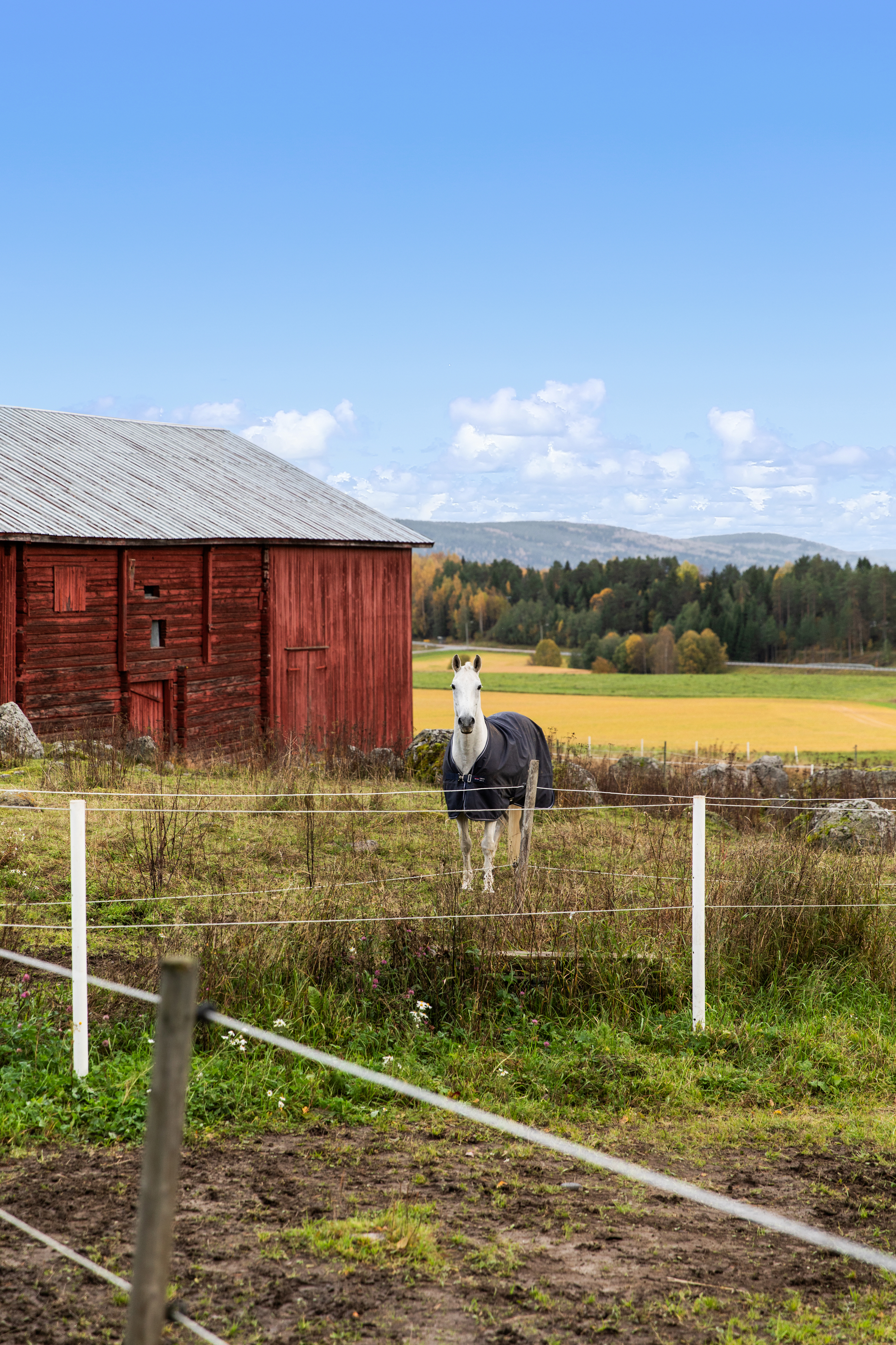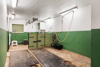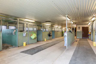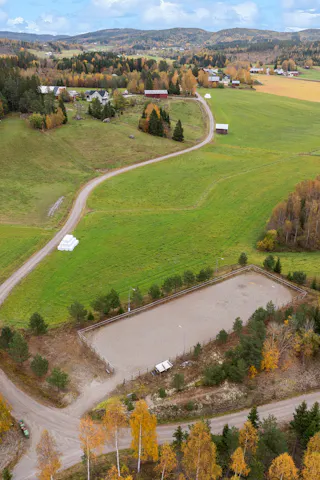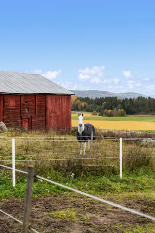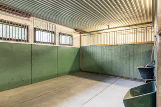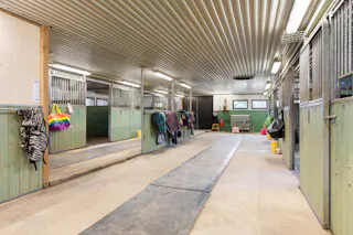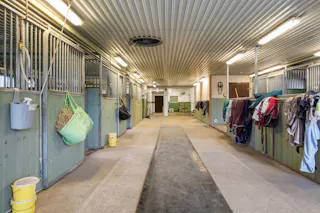 Till hästverksamheten finns ett stort stall med åtta boxar och tillhörande utrymmen, välplanerat och redo för både hobbyryttare och professionell verksamhet. I samma byggnad finns även ett mindre ridhus som förlänger säsongen och gör träningen smidig året runt. Hagar omger gården och det finns gott om plats för hästarna att röra sig fritt. Till gården finns också en belyst och inhägnad paddock.