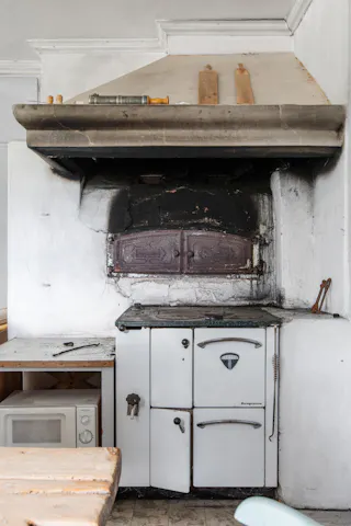 Sovrum 3/kontor och pentry med vedspis och två skrubbar för förvaring.