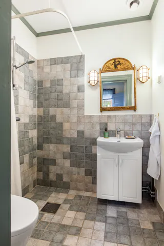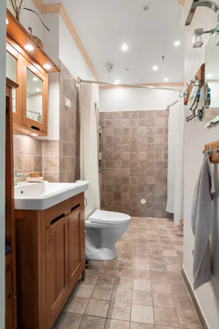 Badrum med kakel och klinker och golvvärme. Dusch, toalett och handfat.