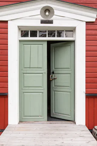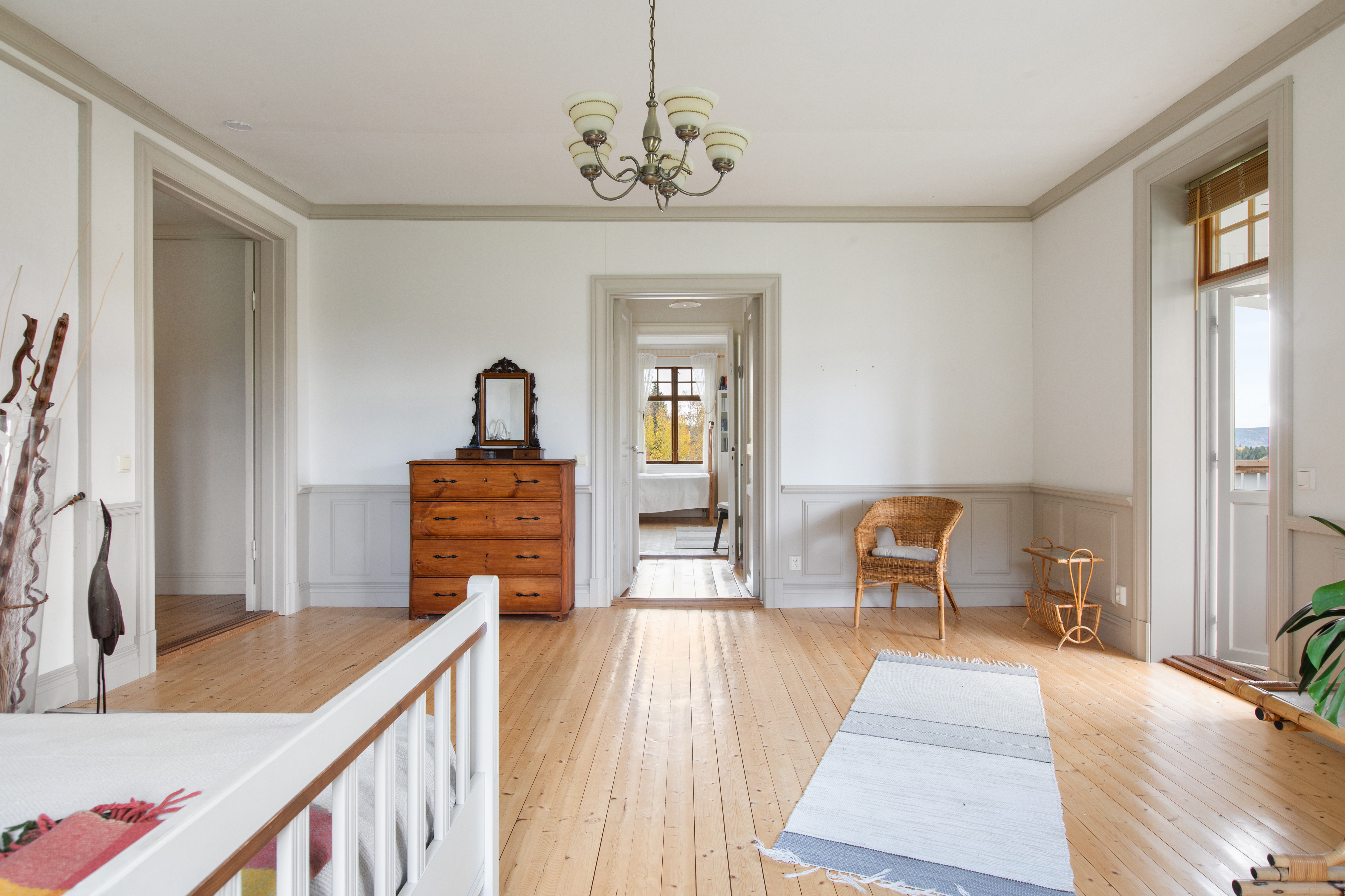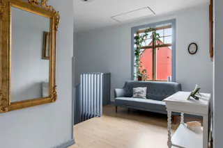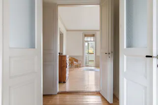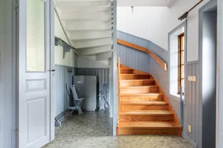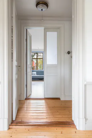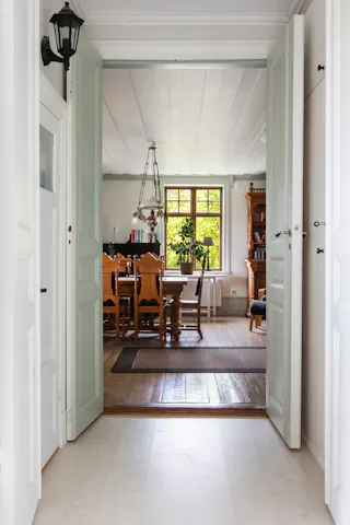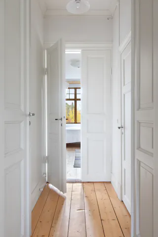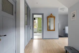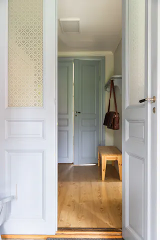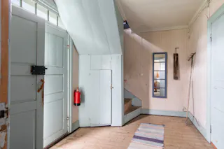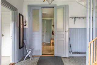 Hall och trapphus och stora fina pardörrar in mot salen. Avhängningsmöjligheter.