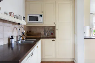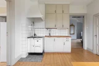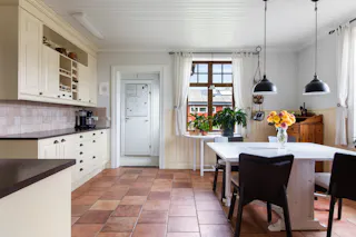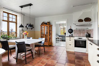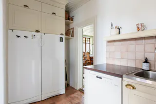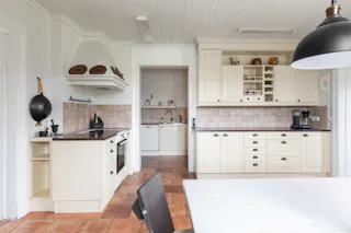 Kök med krämfärgade ljusa och spårade luckor samt klinkergolv med golvvärme. Vedspis. Spis med plattor, diskmaskin, kyl och frys.