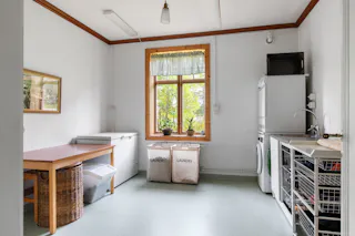 Tvättstuga med tvättmaskin och torktumlare. Kakelugn.
