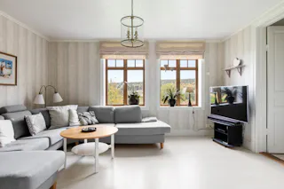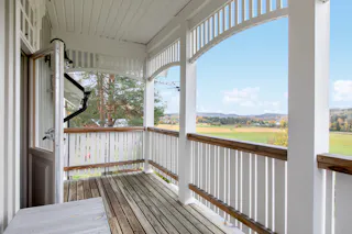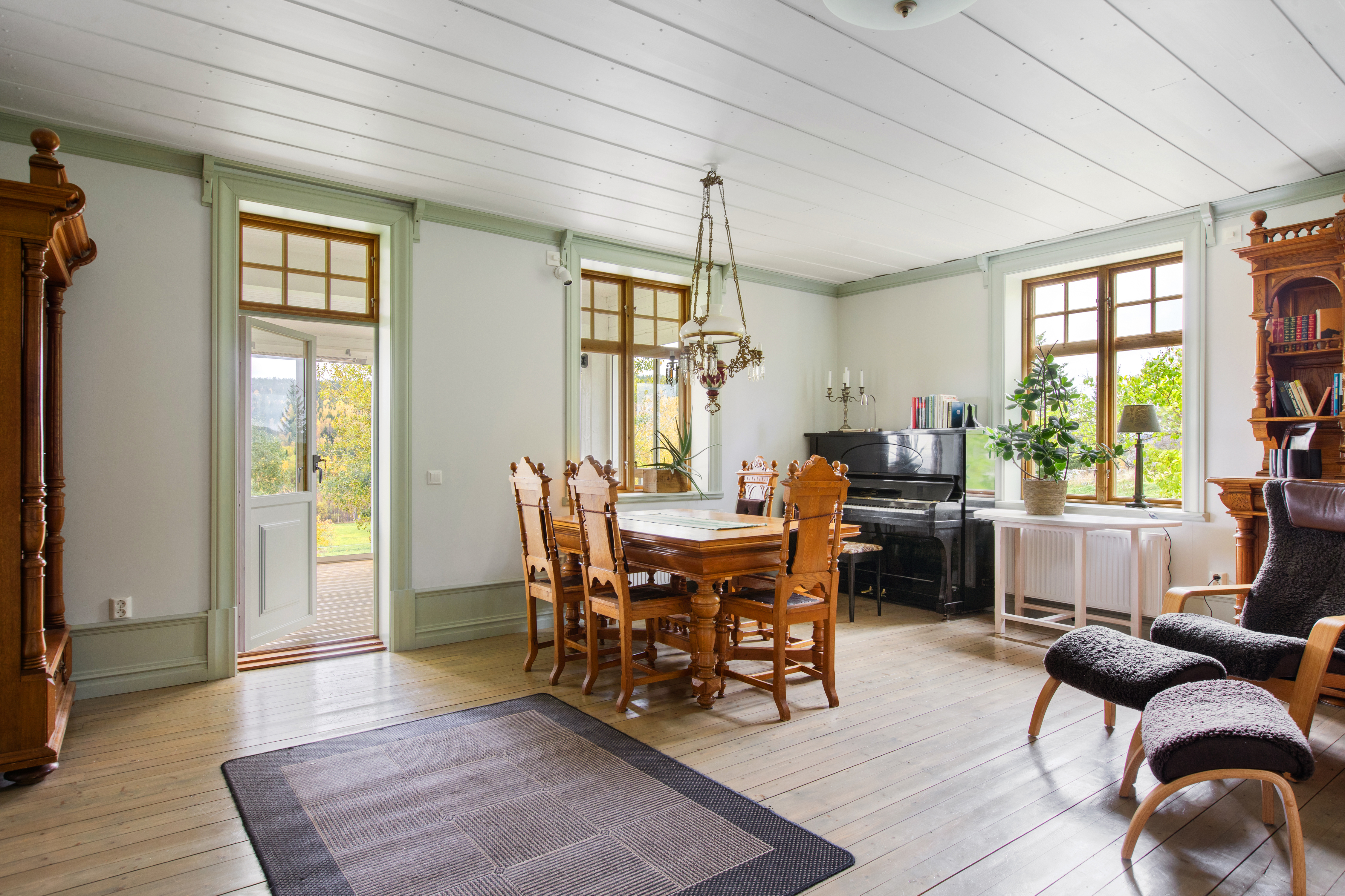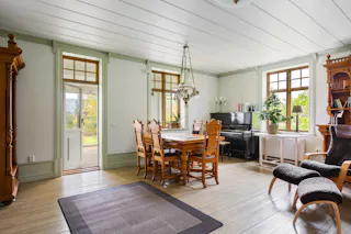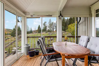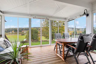 Stor sal med kakelugn och utgång till den inglasade altanen med fantastik vidsträck vy. Altanen har infravärme.