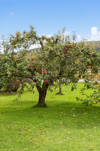 Uppvuxen trädgård med diverse fruktträd.