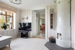 Vardagsrum med golvvärme och kakelugn.
