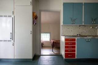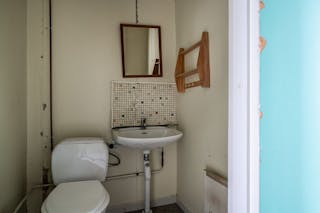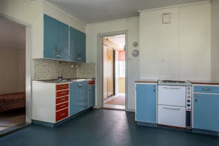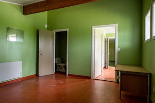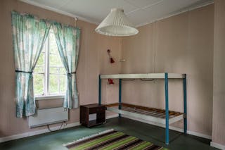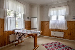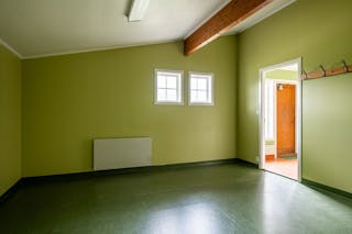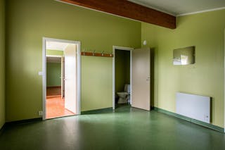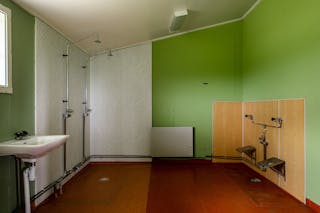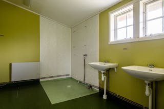 Resterande delar har genomgående plastmatta på golv och mestadels målade väggar. Köket är utplockat och finns ej installerat. Ena duschrummet har två duschplatser och två handfat och i högra delen är detta utplockat.