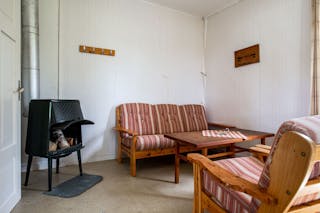 Stuga som fungerat som servicebyggnad med omklädningsrum, matdel, duschar och bastu men skulle likväl kunna fungera som bostadshus efter modifiering. El och vatten finns men har renoveringsbehov och kräver underhåll.