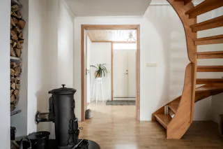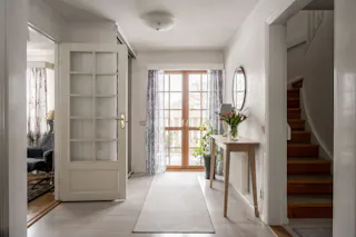 Ljus hall med värmande braskamin