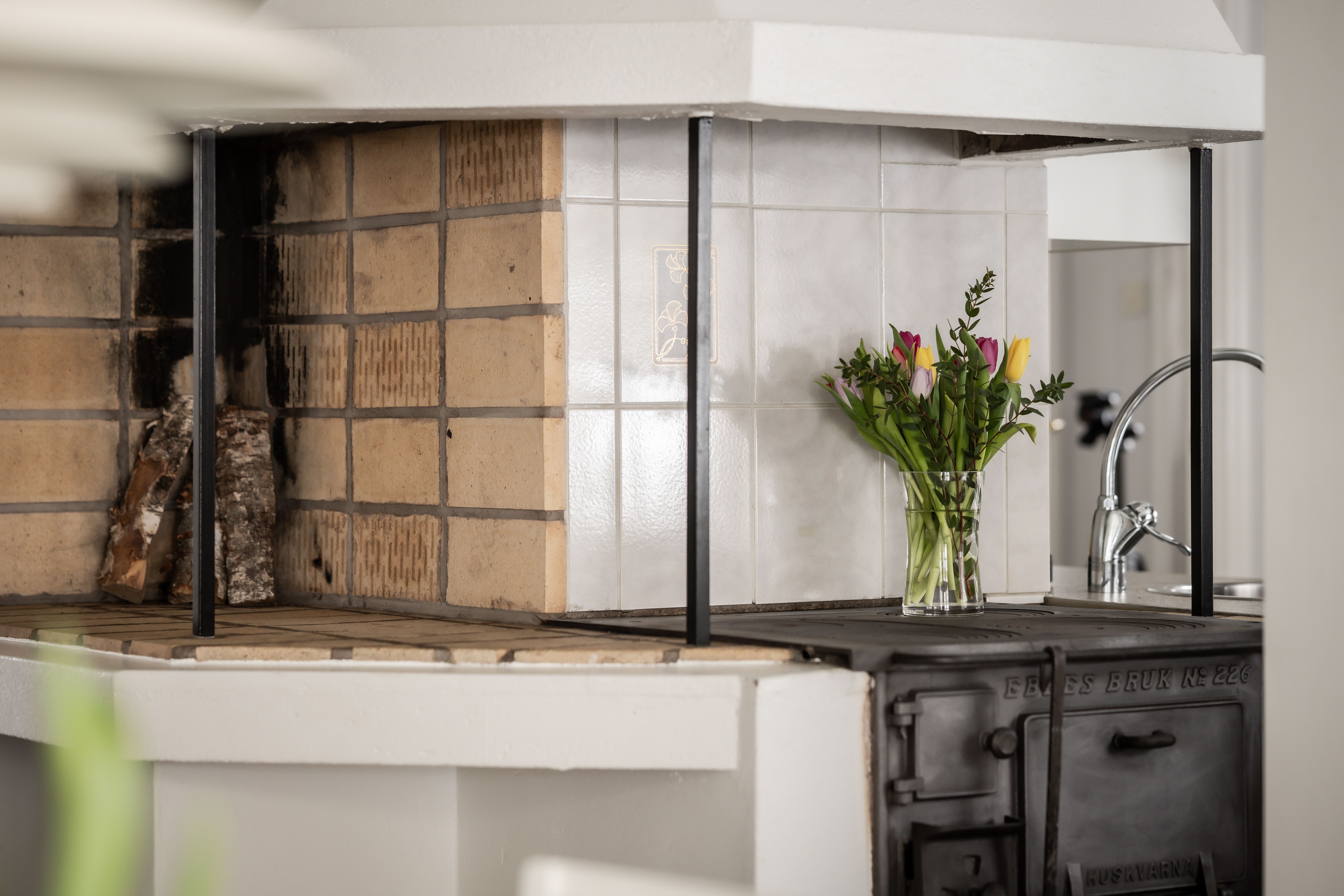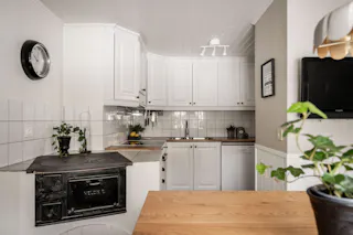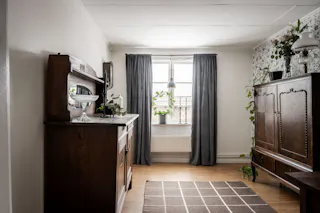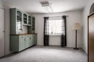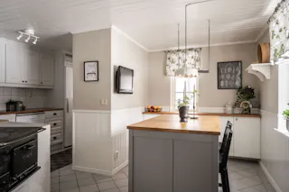 Kliv in i ett kök där genuin charm möter modern funktion. Här sätter den vitmålade bröstpanelen och de ljusgrå tapeterna en tidlös karaktär som harmonierar vackert med det praktiska, ljusgrå klinkergolvet. Den absoluta höjdpunkten är den stämningsfulla vedspisen som påminner om svunna tider och sprider en ljuvlig värme i rummet. Köket är utrustat med kyl, spis, fläkt och diskmaskin, och vid fönstret finns den givna platsen för ett mindre matbord där morgonkaffet kan avnjutas. Från köket når du även ett generöst förrådsutrymme som erbjuder praktisk förvaring och där frysen är placerad för att maximera arbetsytorna i själva köket.