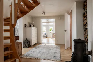 En rymlig och funktionell hall med fokus på ordning och reda. De vita ytskikten och det ljusa golvet skapar en luftig känsla, medan den strategiskt placerade braskaminen blir den naturliga mittpunkten som värmer hela entréplanet. Här finns ypperliga avhängningsmöjligheter som gör det enkelt att hålla ordning i vardagen.