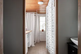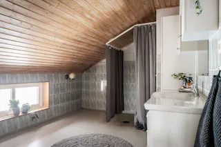 Här erbjuds ett lättskött badrum med enhetliga ytskikt i ljusgrått. Det trärena panelklädda snedtaket ger rummet en unik dimension och en ombonad känsla. Utrustningen består av dusch, wc samt handfat med kommod och tillhörande belyst spegelskåp.
