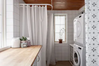 Stilrent inrett badrum med klinkergolv och vitt kakel. Utrustningen består av dusch, handfat med kommod samt wc. Rummet har även en dedikerad yta för tvätt, utrustad med tvättmaskin, torktumlare och en arbetsbänk för smidig hantering av tvätten. Ett komplett och lättskött badrum.