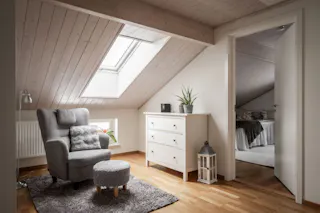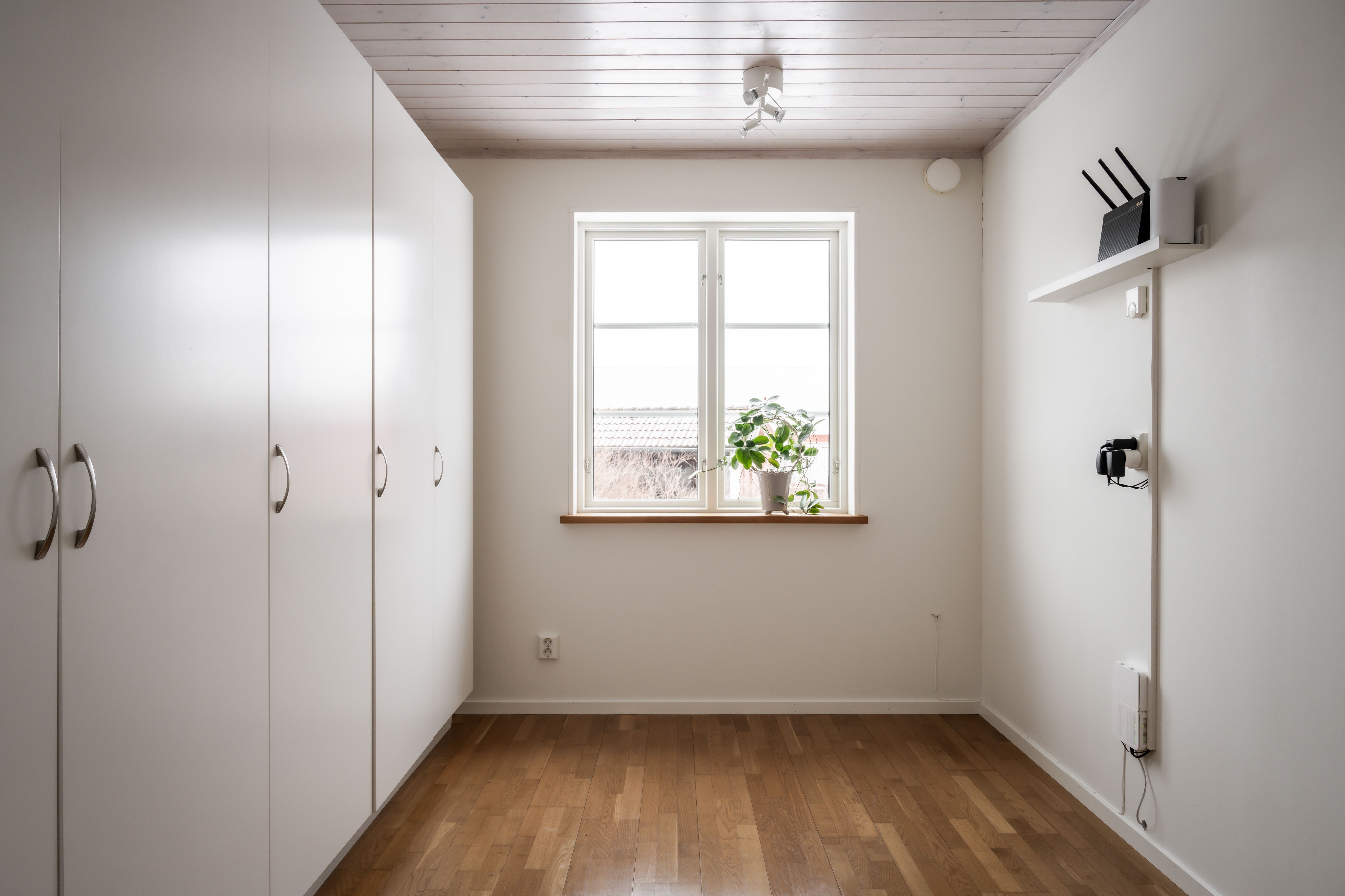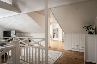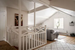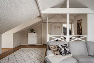 Välkommen upp till ett allrum utöver det vanliga! Detta generösa utrymme är naturligt uppdelat i två delar som idag nyttjas som ett trivsamt TV-rum och en rofylld läshörna. Det ljusa snedtaket skapar en ombonad vindskaraktär som balanseras av ett fantastiskt ljusinsläpp från tre fönster och ett takfönster. I TV-delen ger det gedigna trägolvet och den vitmålade träpanelen en varm och rustik känsla, medan läshörnan bjuder på stilren parkett och vita väggar.