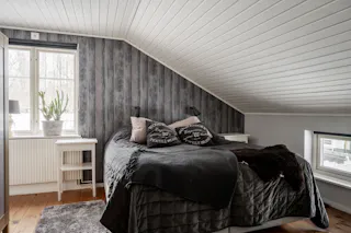 Övervåningens största sovrum präglas av sitt vackra furugolv och en fondtapet med panelmotiv. Rummet har ljusa ytskikt i övrigt och ett gott ljusinsläpp från två fönsterpartier. En gedigen och charmig miljö med delvis snedtak som ger en extra dimension till rummet.