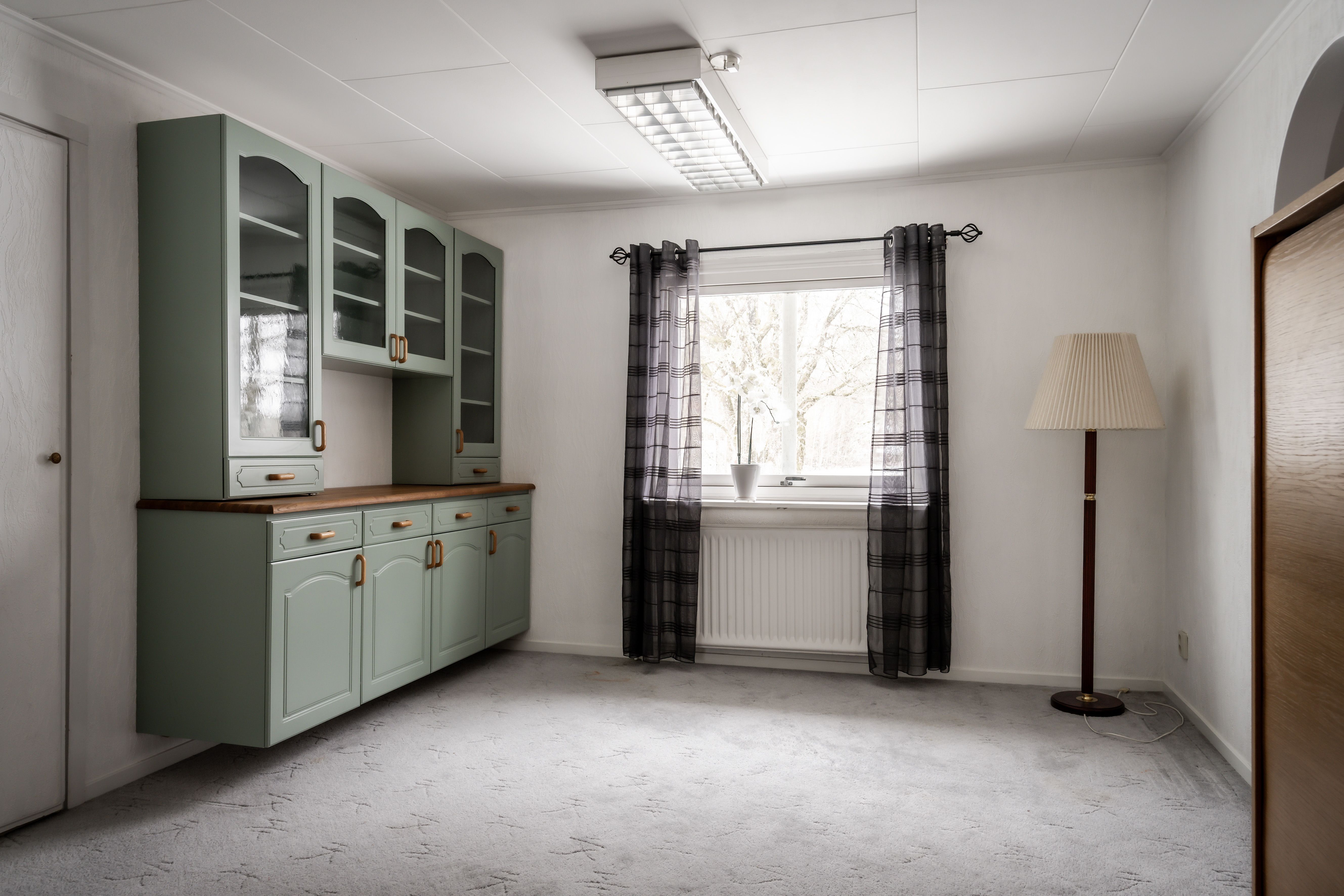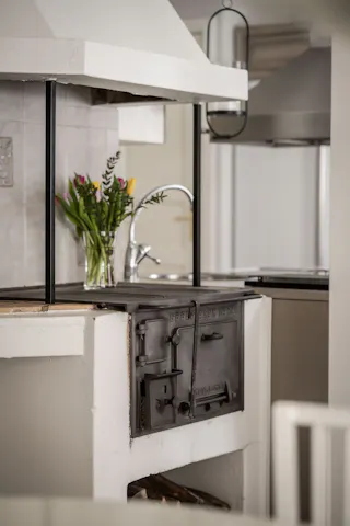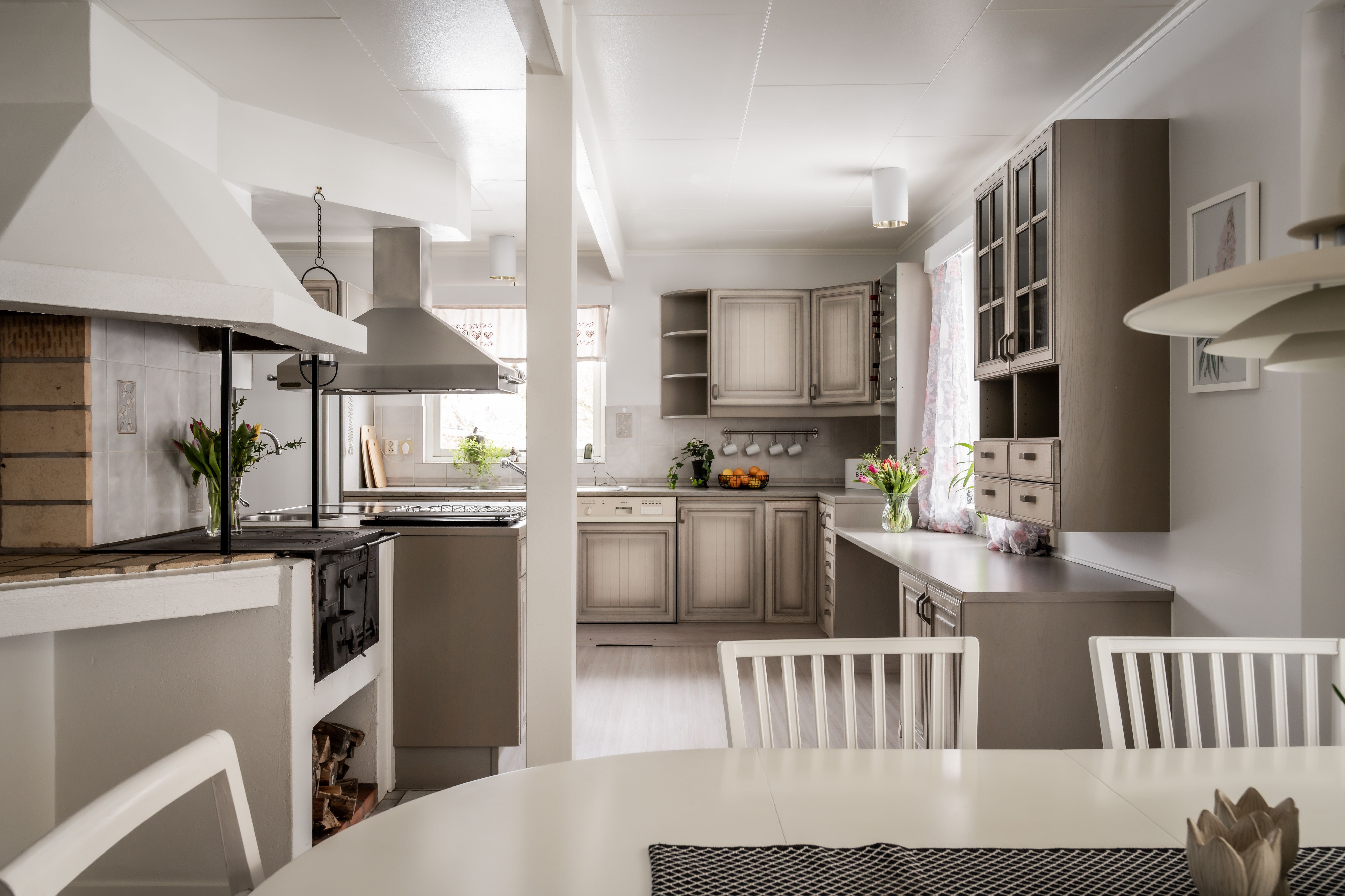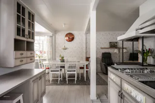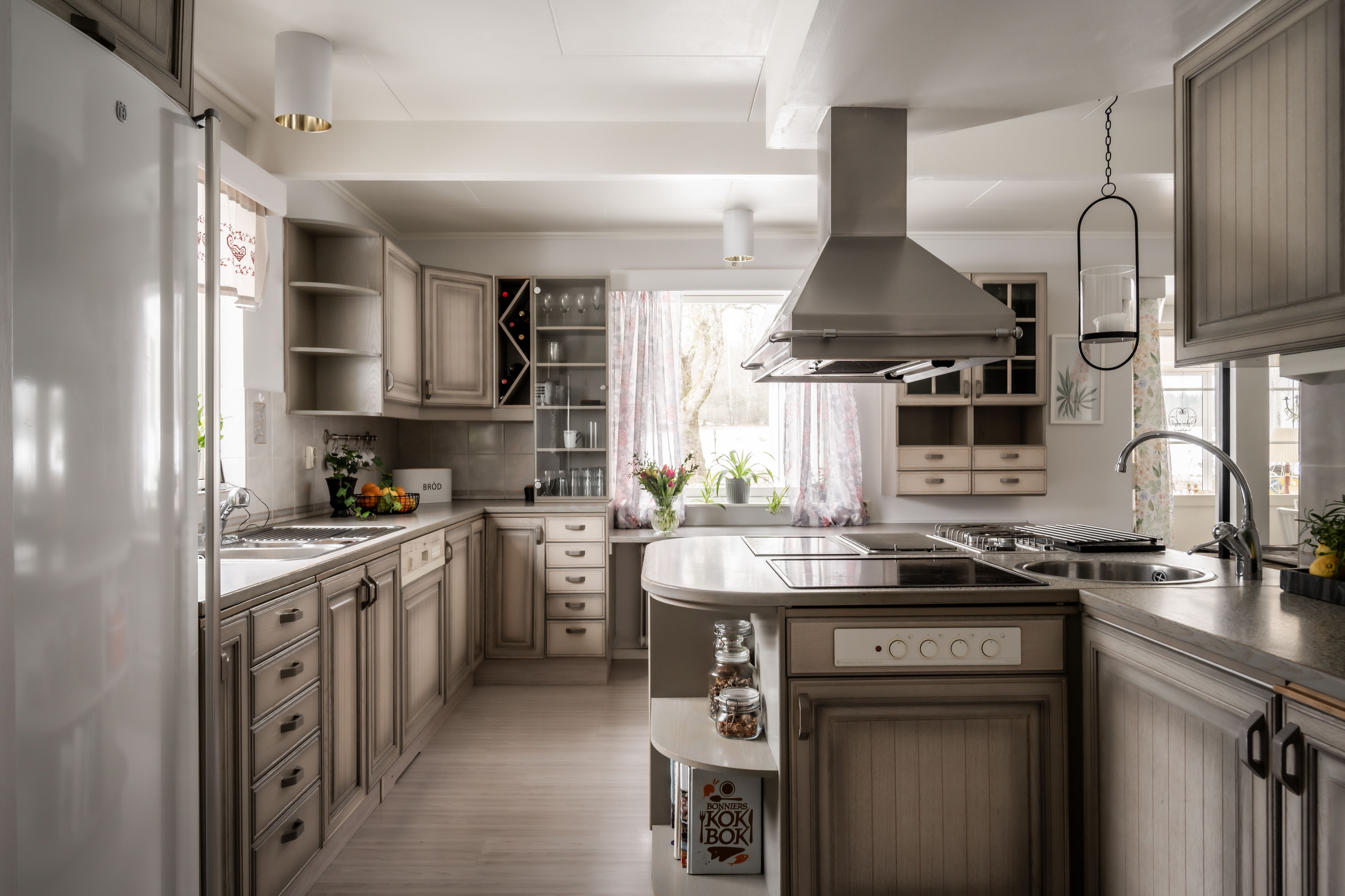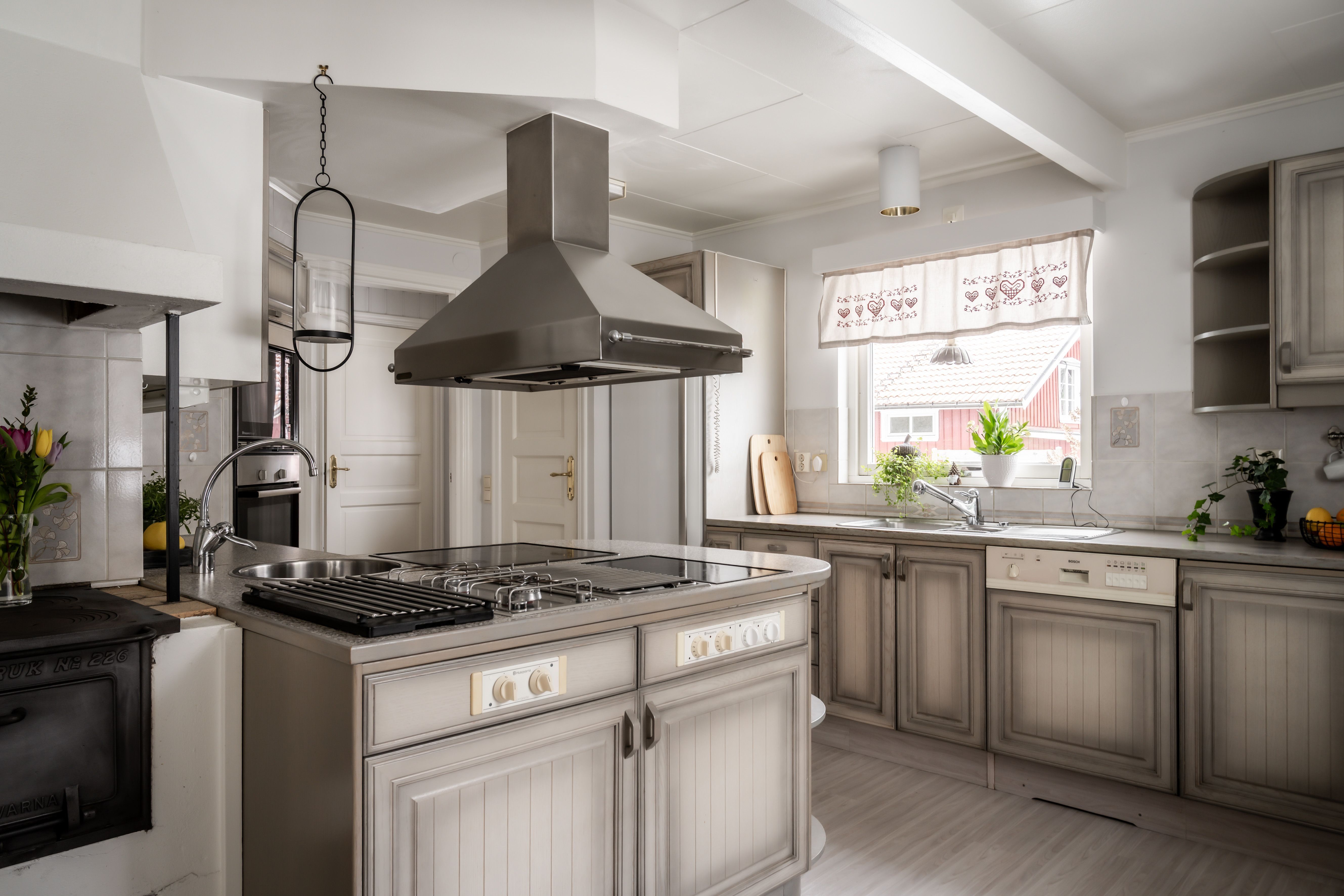 Ett kök som balanserar den lantliga charmen med dagens alla bekvämligheter. De ljusgrå väggarna och de enhetliga fronterna på skåp och lådor skapar en harmonisk och stilren atmosfär som kompletteras av ett tåligt laminatgolv. Här är matlagningen ett rent nöje, oavsett om du väljer den nostalgiska vedeldade köksspisen eller den moderna utrustningen med både spishäll, gasplattor, inbyggd ugn, mikrovågsugn, diskmaskin och kyl. Från köket kliver du direkt ut i det härliga uterummet i soligt söderläge – en underbar förlängning av bostaden där du kan njuta av ljuset och värmen från tidig vår till sen höst.den moderna utrustningen. Köket är fullt utrustat med både spishäll och gasplattor, en stilren fläktkåpa, inbyggd ugn och mikrovågsugn, diskmaskin samt kyl.