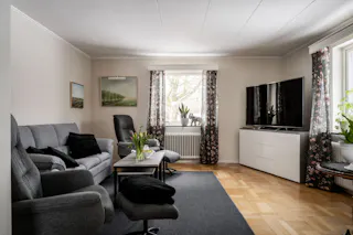 Luftigt vardagsrum med parkettgolv och vita väggar. Ljusinsläpp från tre fönster ger en härlig rymd. Här finns gott om plats för en stor soffgrupp och direkt utgång till en altan i soligt sydostläge, med en trevlig utsikt över trädgård och ängsmark.