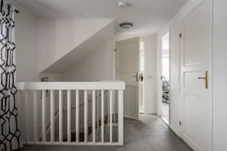 Övre hall som leder vidare till våningsplanets övriga rum. Härifrån finns utgång till en balkong som bjuder på en fin vy över omgivningarna.