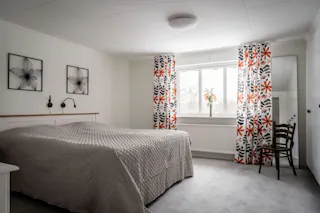 Ett rymligt och ljust sovrum som enkelt rymmer en dubbelsäng. Med sex garderober finns det gott om plats för kläder och förvaring, vilket frigör yta i rummet. Ytskikten består av en behaglig ljusgrå heltäckningsmatta och ljusa väggar. Ljusinsläppet från det stora fönstret bidrar till en luftig och trivsam miljö.