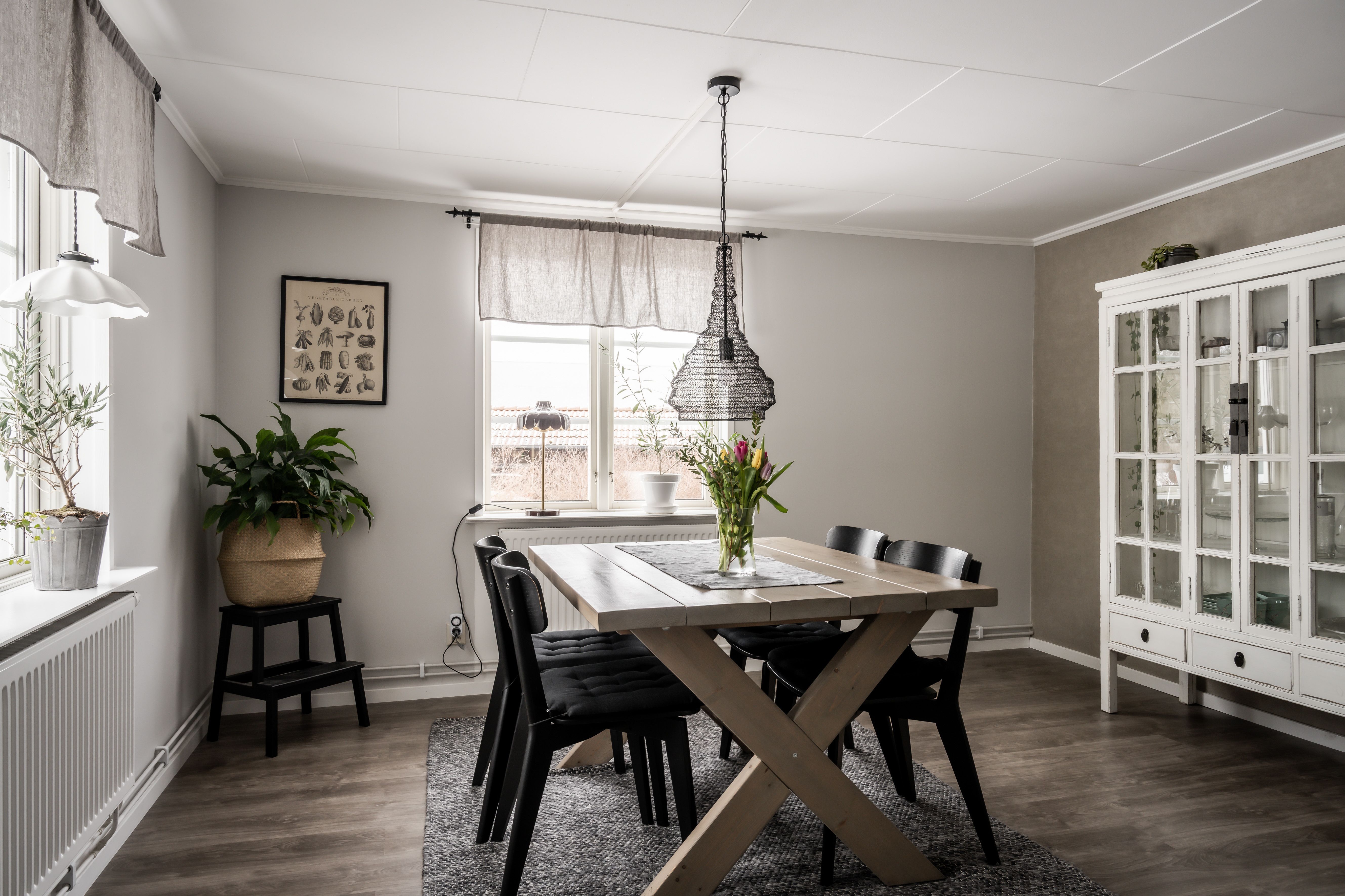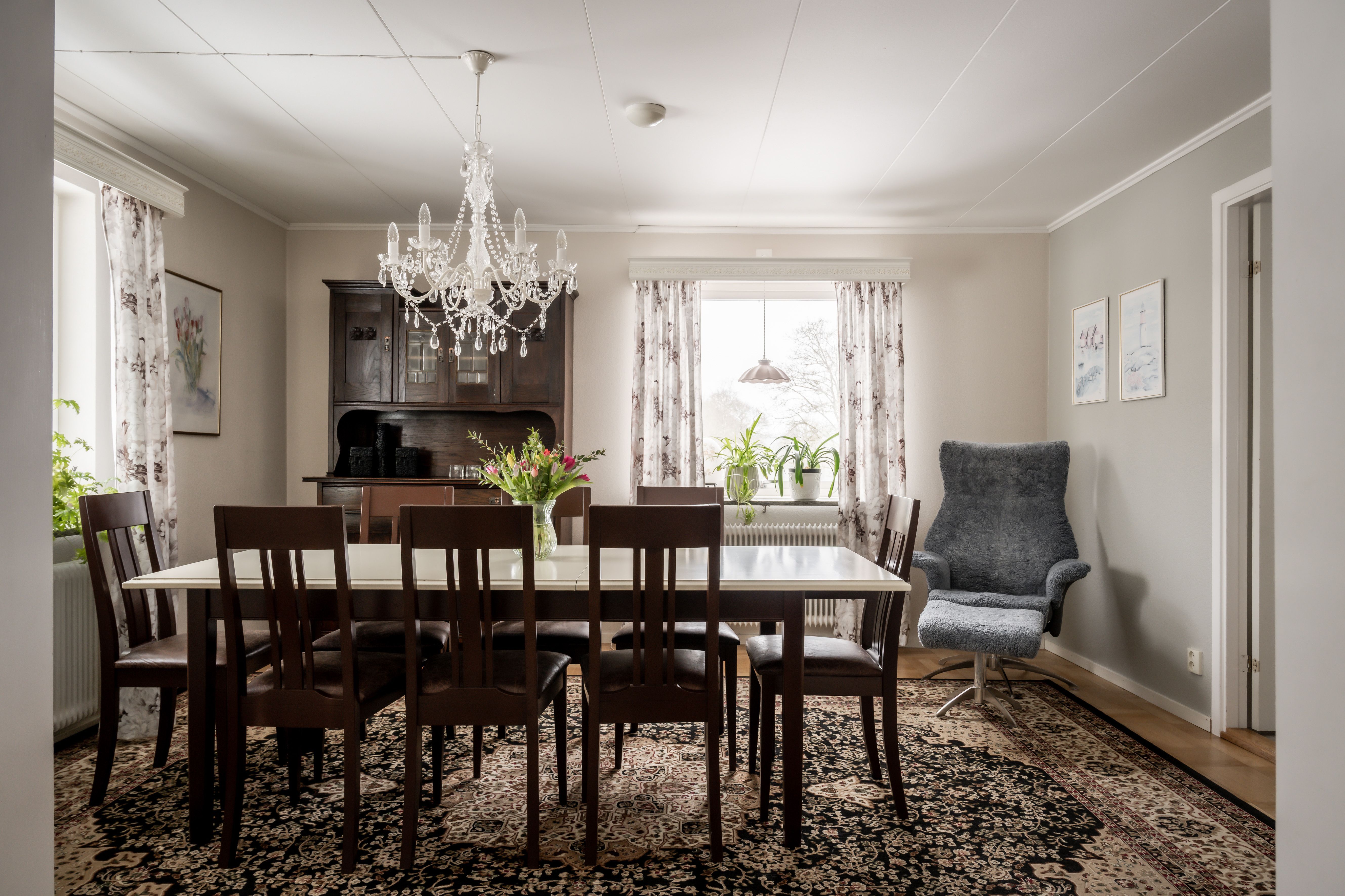 Ett luftigt och ljust matrum som karaktäriseras av sitt genomgående ljusinsläpp. Rummet har en modern och enhetlig känsla med ljust grå tapeter och ett tåligt, grått laminatgolv. Flexibiliteten är stor och rummet sväljer enkelt en större matgrupp, perfekt för både vardagsmiddagar och festliga tillfällen.