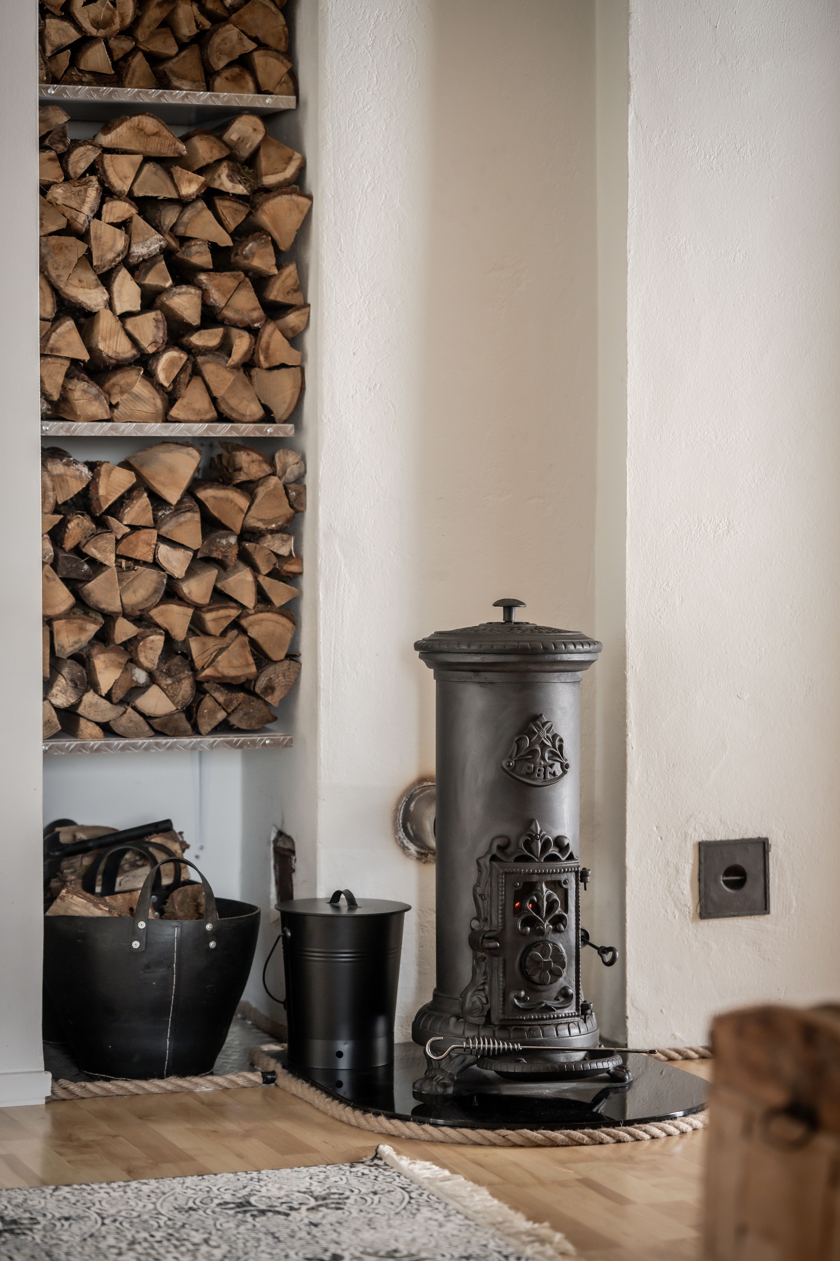 Uppvärmning: Värmepump, jordvärme. Vattenburen golvvärme i den nya delen. Braskamin och köksspis