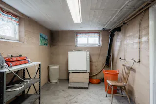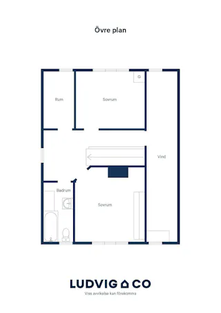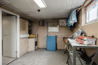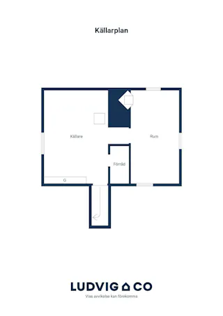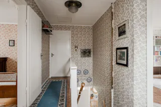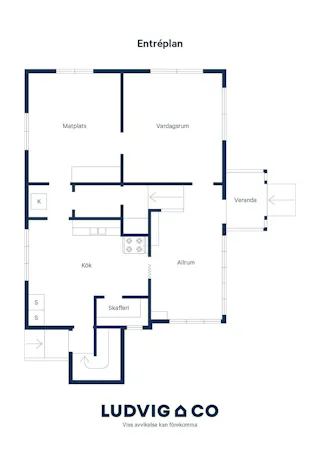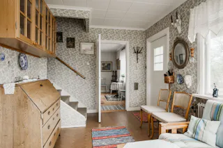Nedre plan fördelar sig över köksentré, kök med enklare köksinrede, huvudentré/allrum med ingång från liten veranda, vardagsrum, matplats med trägolv samt städskrubb. Övre plan inrymmer hall, två sovrum, rum, kattvind och badrum. Källare med pannrum och tvättstuga samt förrådsutrymmen.