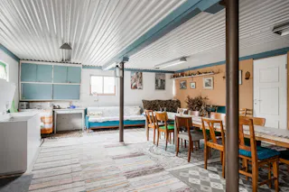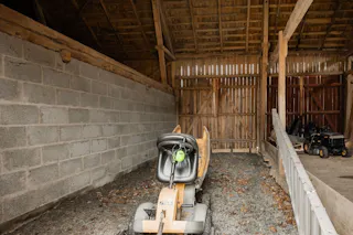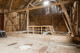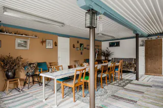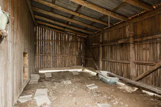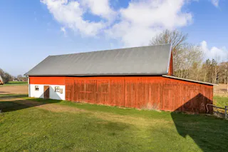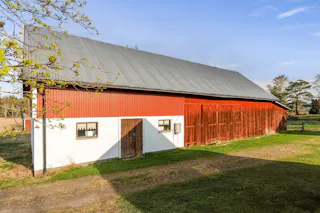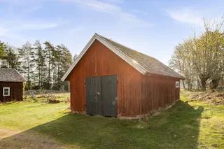 Ladugård med murad stalldel och övrigt i trä. Stalldelen är inredd till en rymlig samlingslokal.