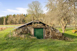 Byggnad med timmerstomme, träfasad och jordgolv. På taket ligger lertegel.