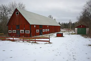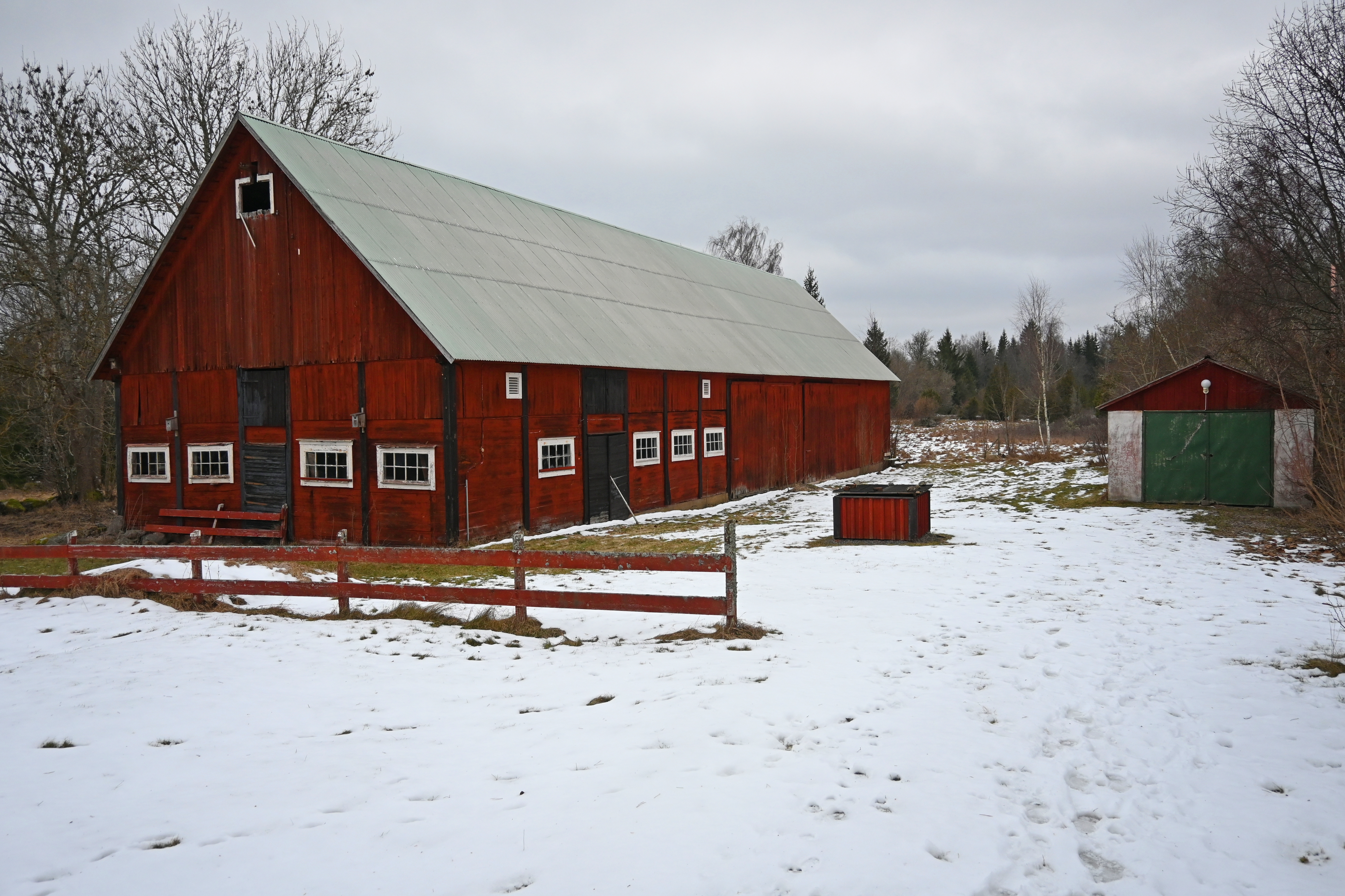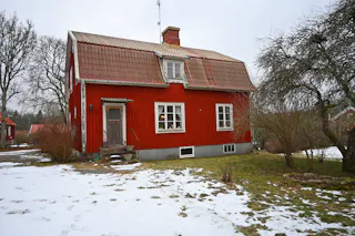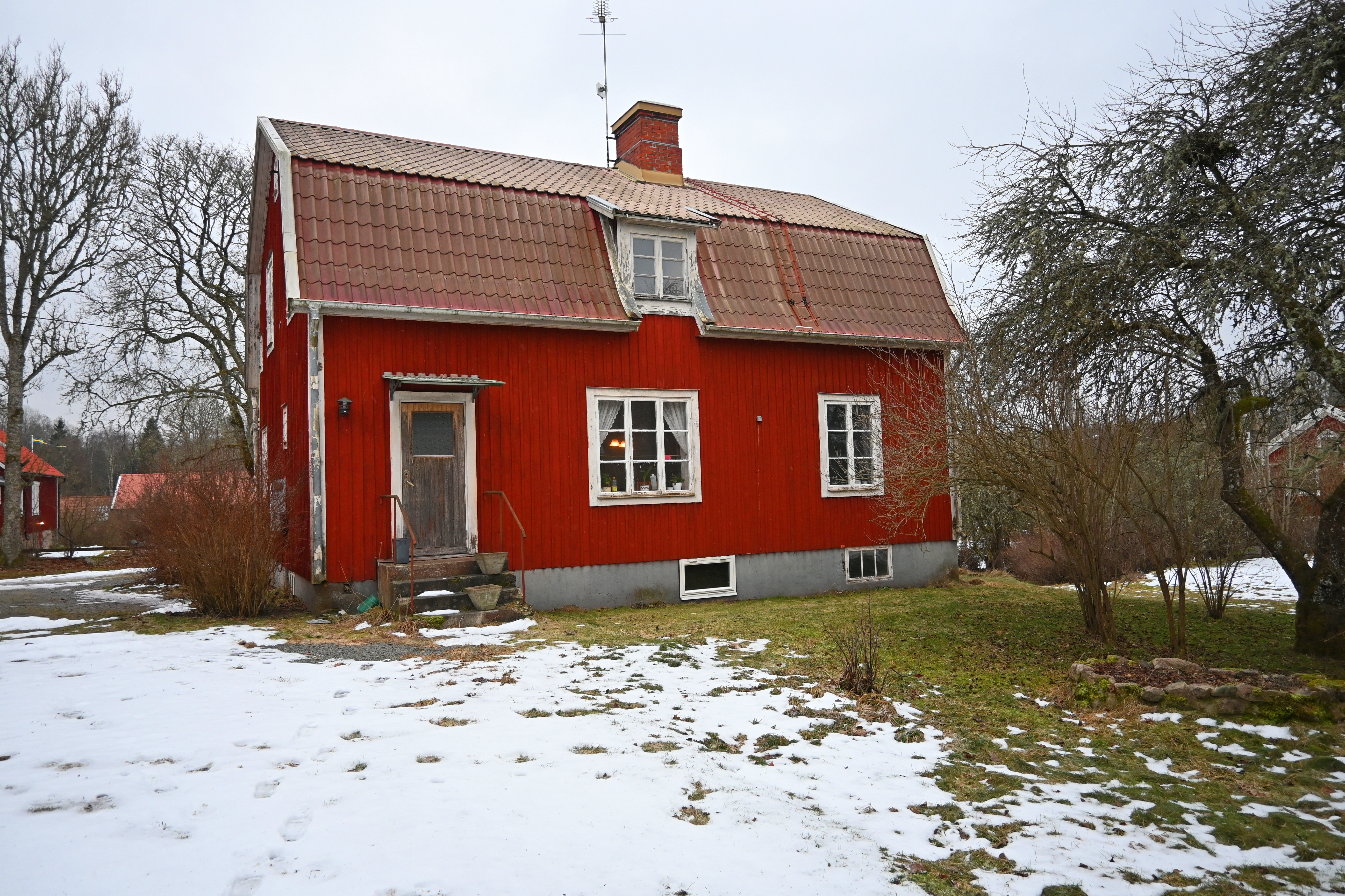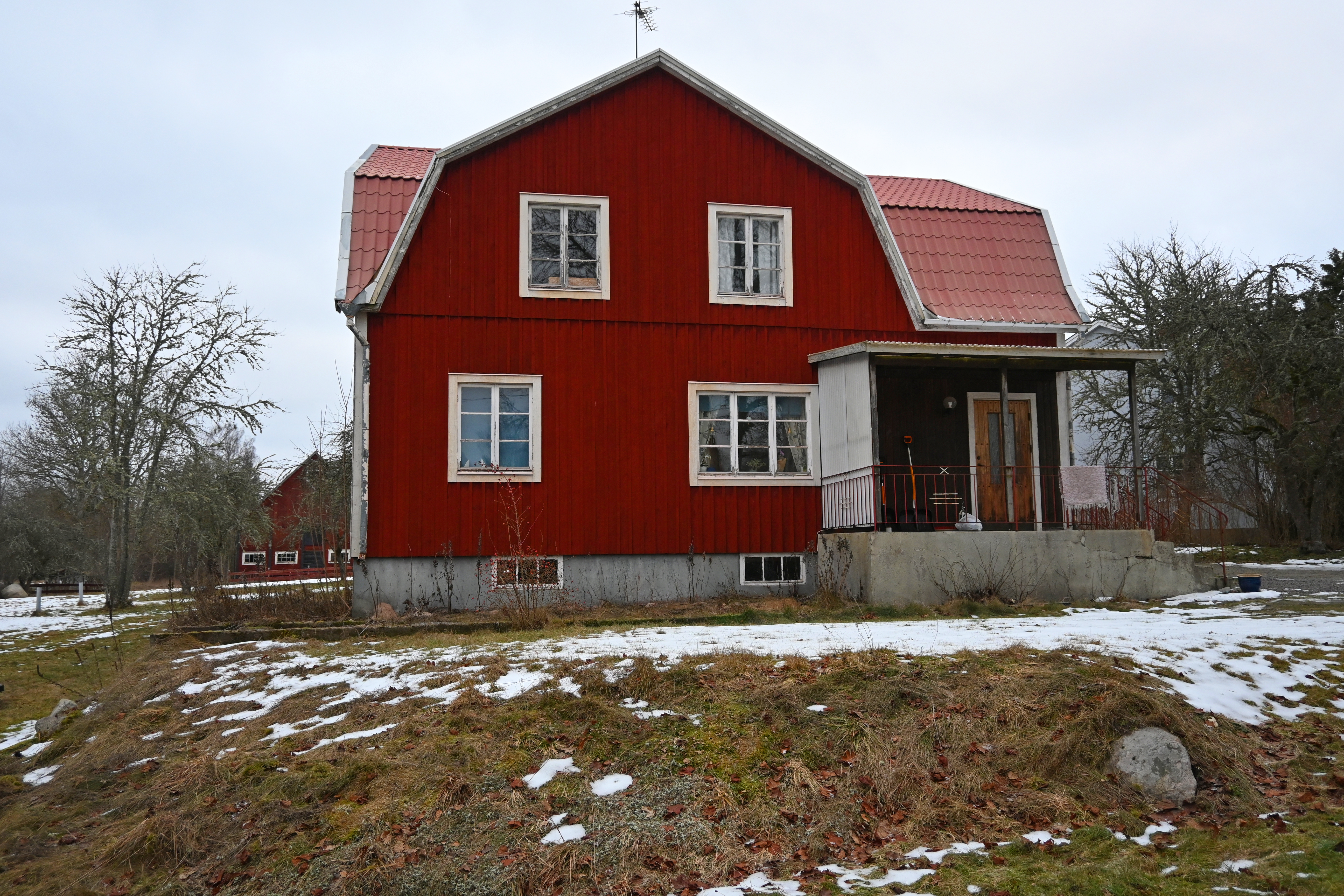 Äldre gårdsbyggnad i trä byggd i 1 ½ plan med källare.