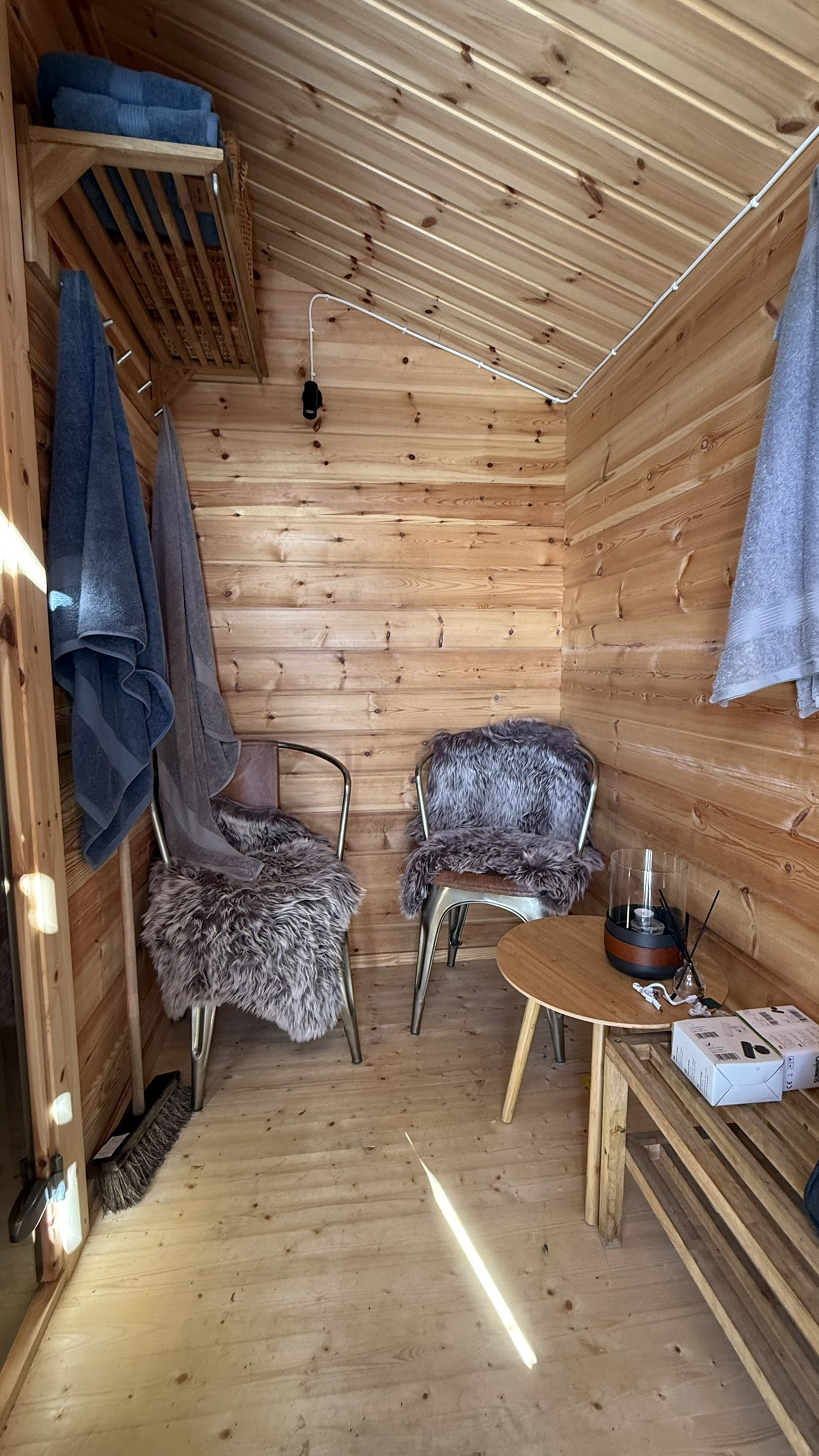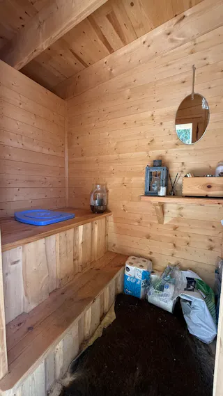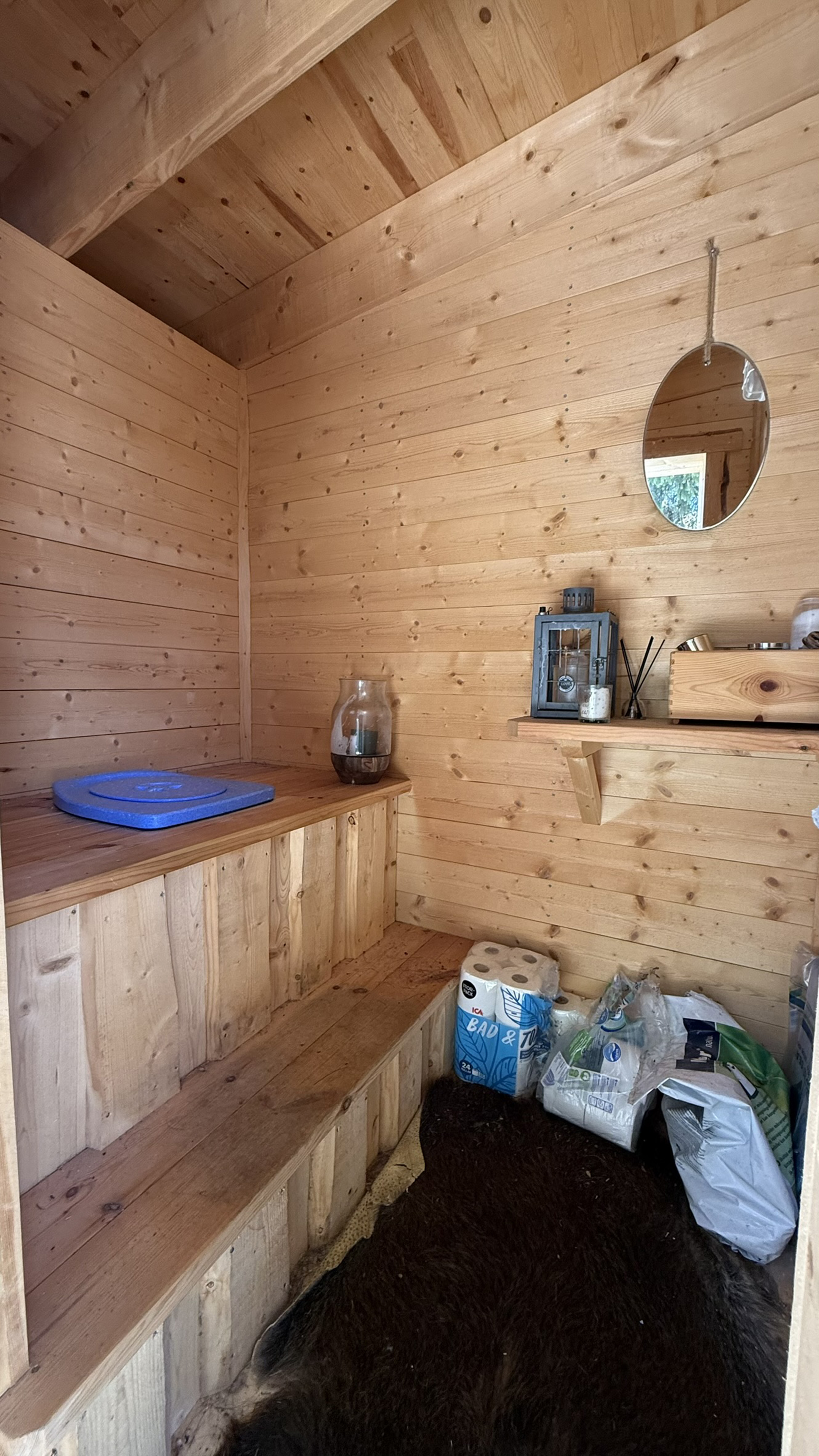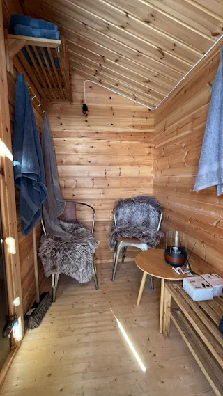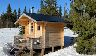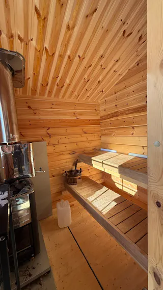 Bastustuga uppförd från Buster-sats med vedeldat bastuaggregat. I bastun finns även relaxdel för cirka två personer.