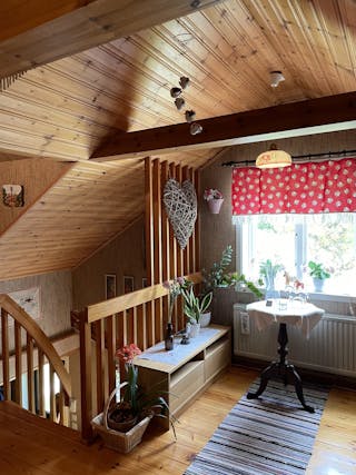 Tre sovrum och hall/tv-rum med öppen spis, samt toalett med handfat.