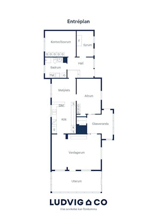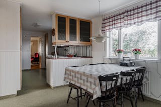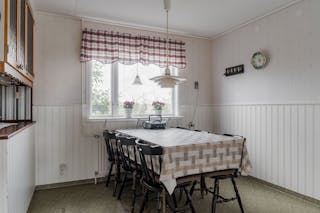 Från hallen är det två trappsteg upp till köket som består av köksdel och matplats.